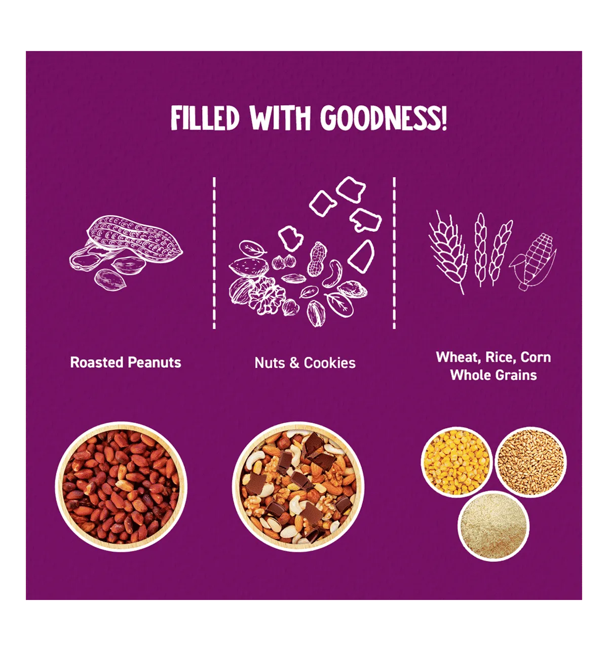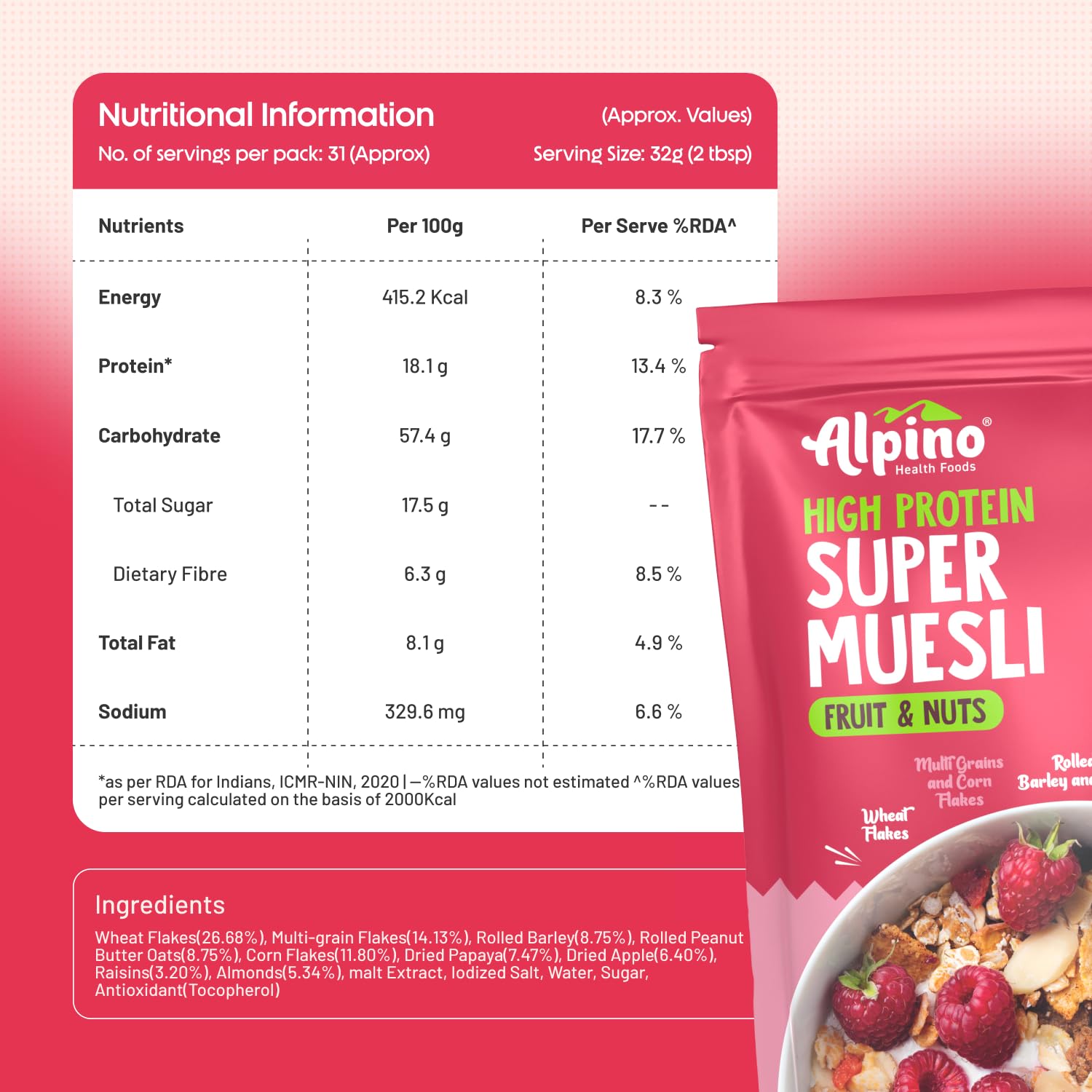 POWER-PACKED BREAKFAST CHOICE : Alpino Peanut Super Muesli Nut Delight is a nutritious blend of roasted peanuts, rolled oats, cornflakes, multi-grains, and real dried fruits, crafted for a healthy and delicious start to your day.