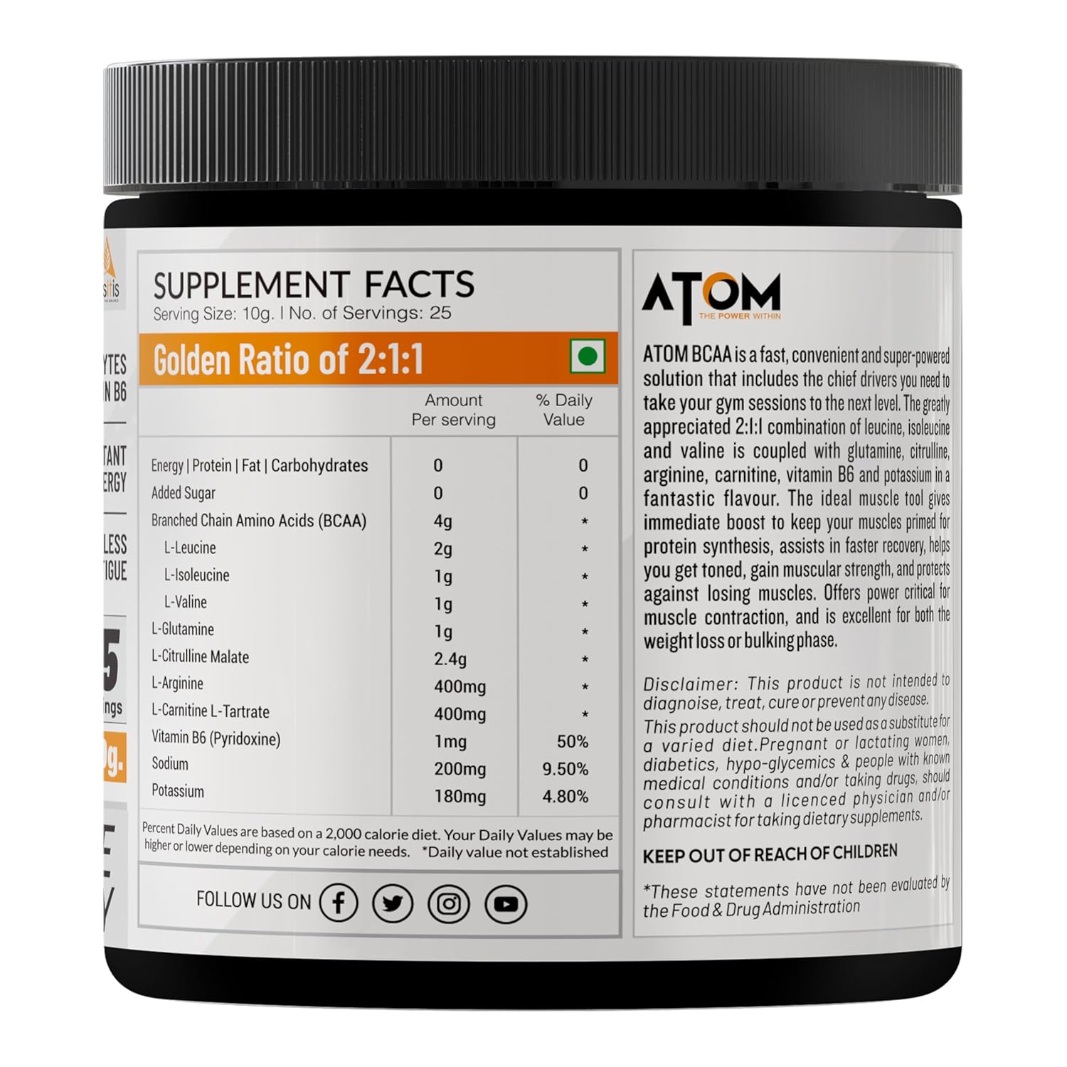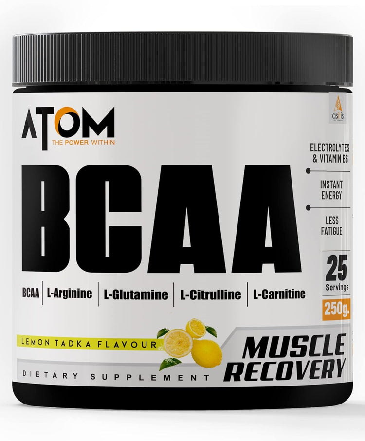 Take 200ml of chilled water, add a scoop of Atom BCAA and mix well. This can be taken before, during or after meals.