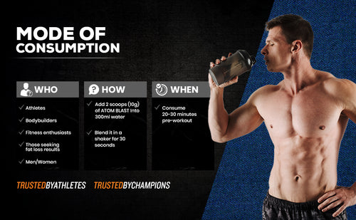 Take 300 ml chilled water in a glass or shaker, add 2 scoops (10g) of ATOM Blast to it, blend it well and consume it before your training.