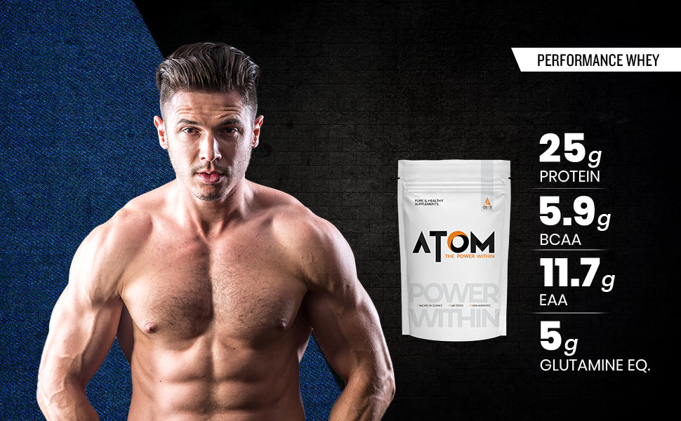 PREMIUM PROTEIN FOR PERFORMANCE & RECOVERY : ATOM Performance Whey combines Whey Protein Isolate and Concentrate to deliver 20g fast-acting protein, 12g carbs, 4.2g BCAA, and 9g essential amino acids per serving. Ideal for lean muscle growth and quick recovery.