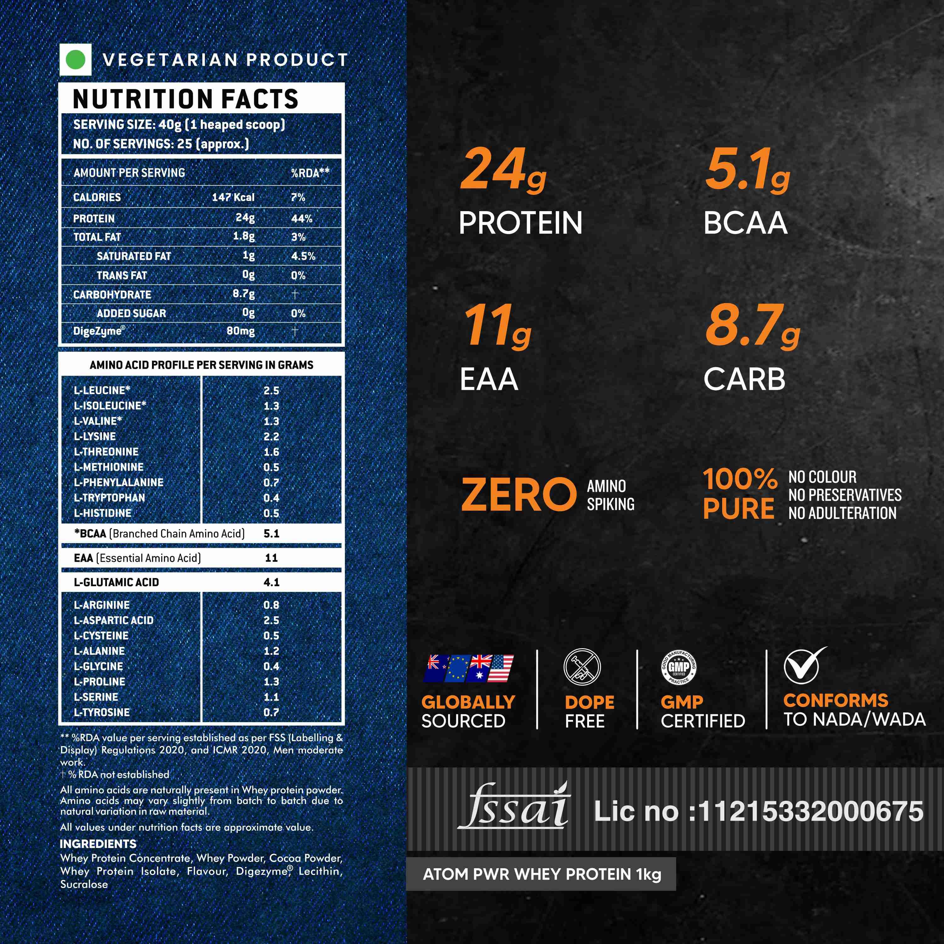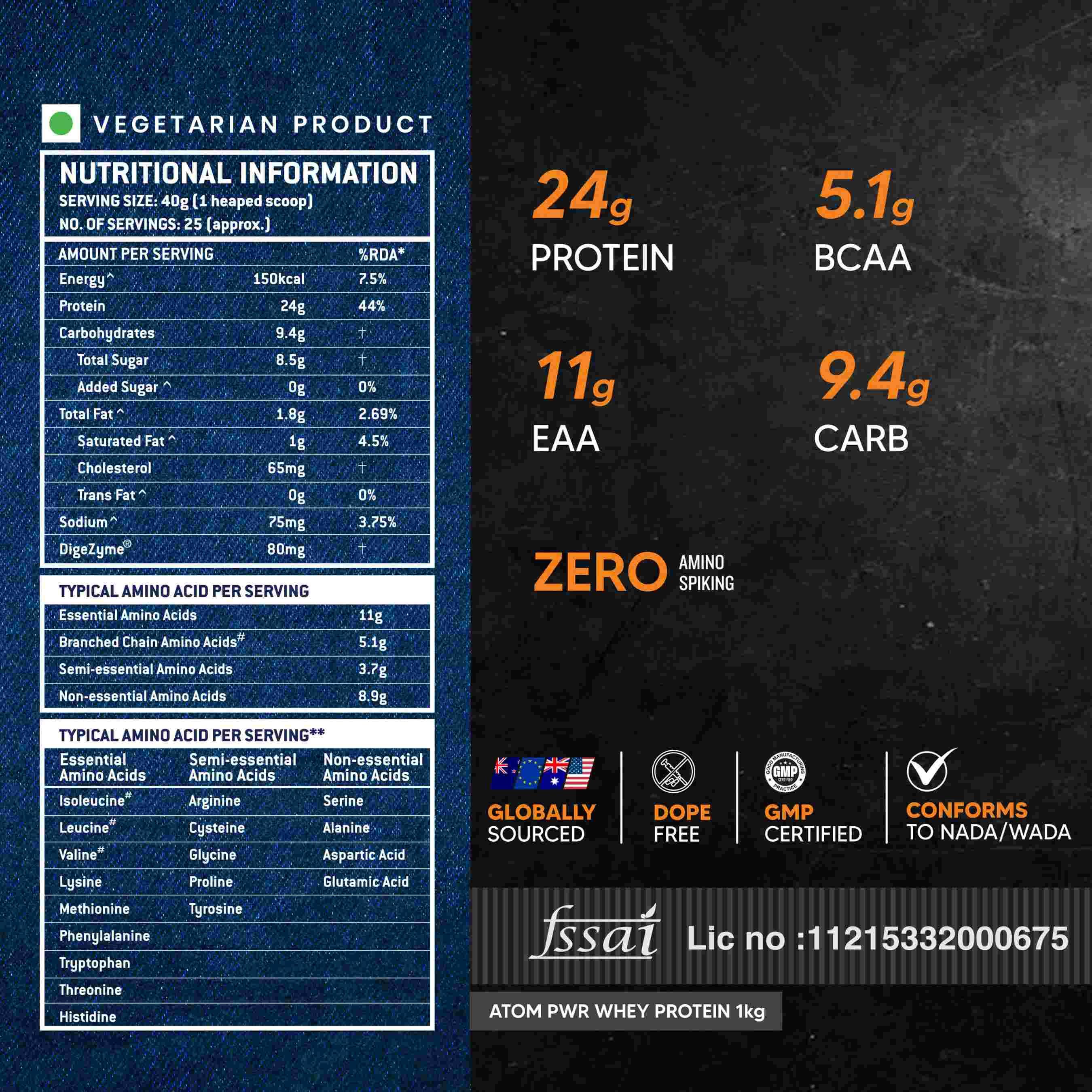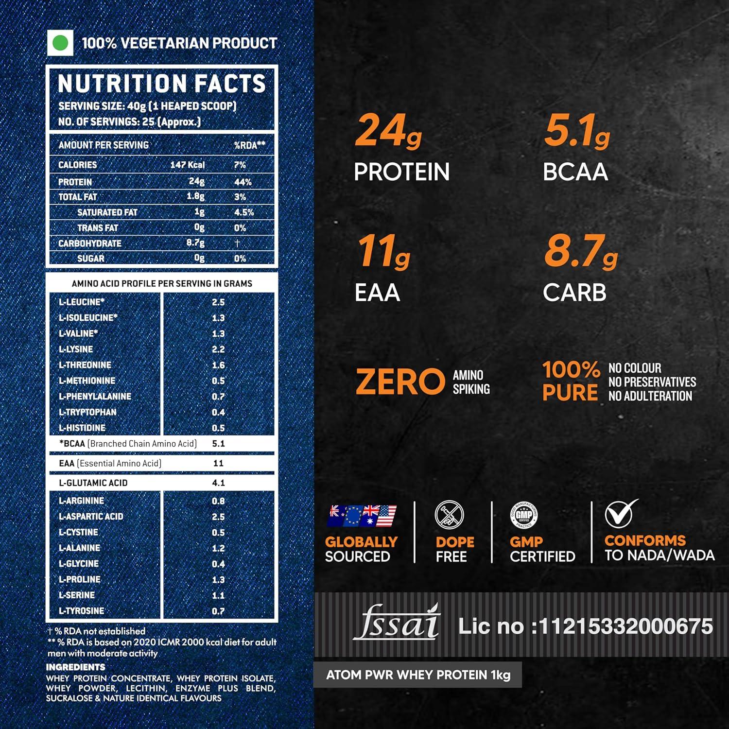 HIGH-PERFORMANCE FORMULA FOR SERIOUS ATHLETES : ATOM PWR Whey delivers 24g protein, 5.1g BCAA, 11g EAA, and 9.4g carbs per serving engineered to support intense muscle-building and strength goals.