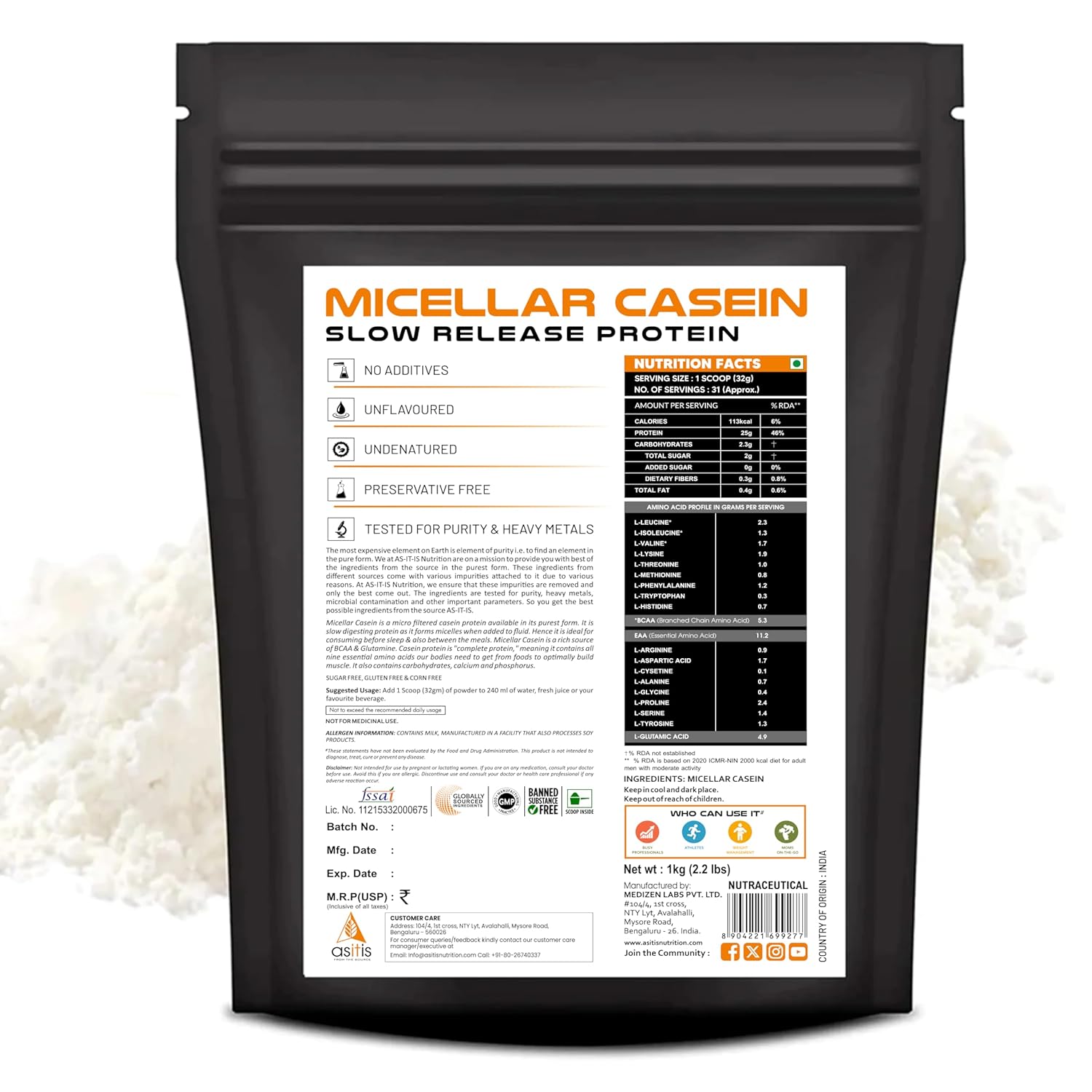 HIGH PROTEIN, NO ADDITIVES : Each serving of AS-IT-IS Micellar Casein delivers 25g protein, 5.3g BCAA, and 4.9g glutamine with no added flavours, enzymes, or artificial ingredients. Just 100% pure micellar casein, exactly as labeled.