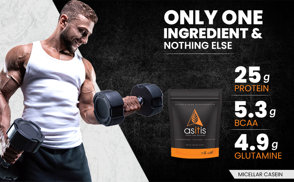 HIGH PROTEIN, NO ADDITIVES : Each serving of AS-IT-IS Micellar Casein delivers 25g protein, 5.3g BCAA, and 4.9g glutamine with no added flavours, enzymes, or artificial ingredients. Just 100% pure micellar casein, exactly as labeled.