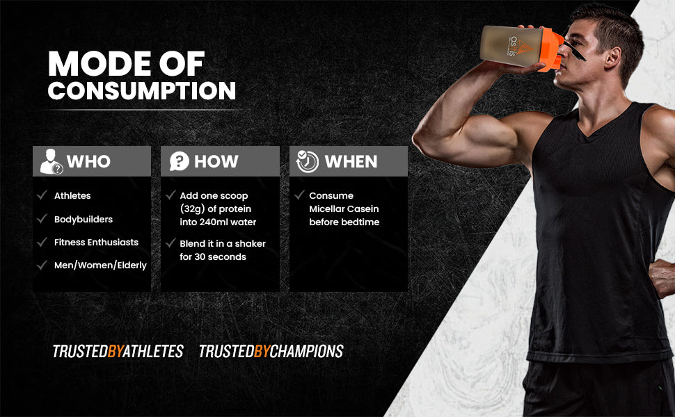 Mix a serving (25g) of Micellar Casein thoroughly into 240ml water and consume it before bed.