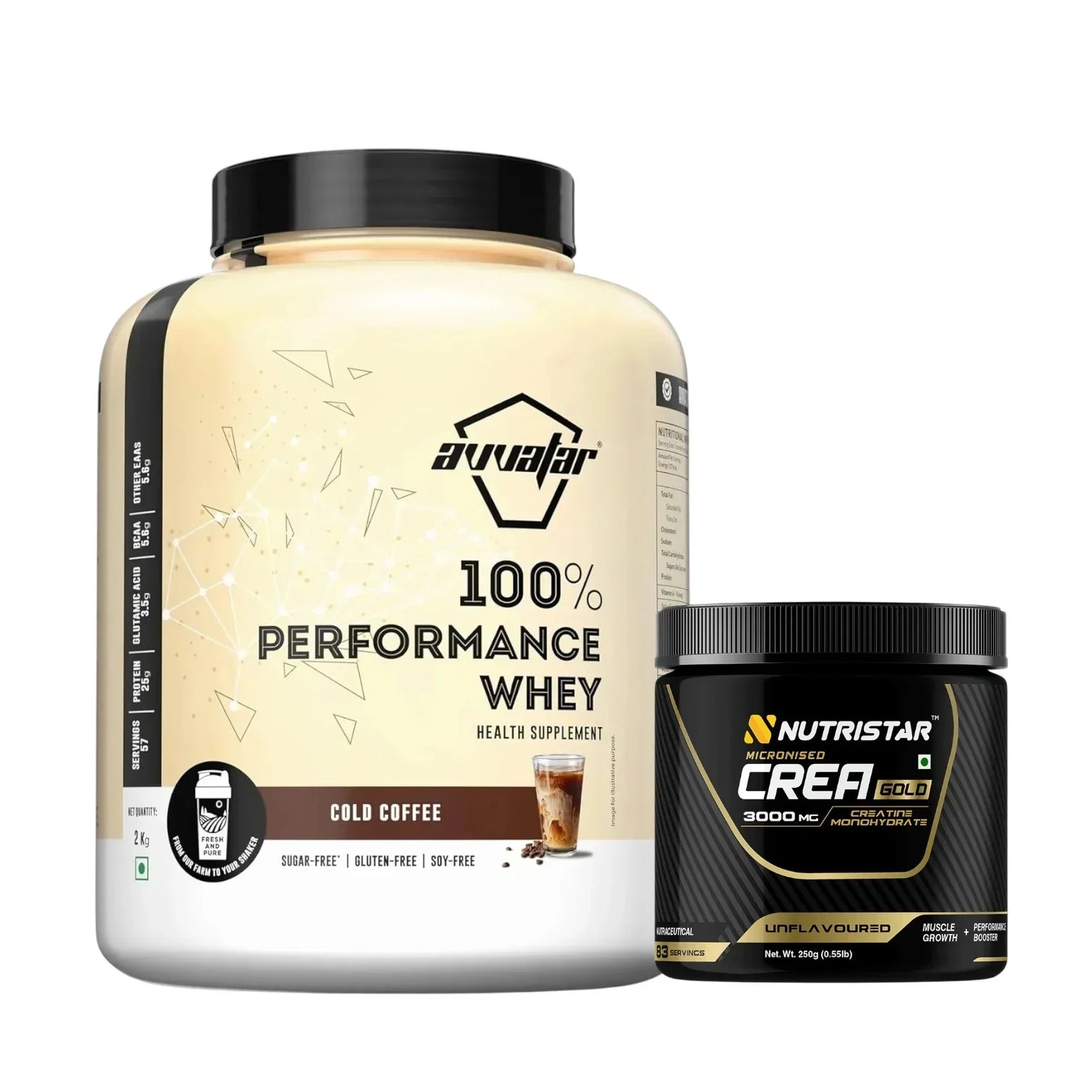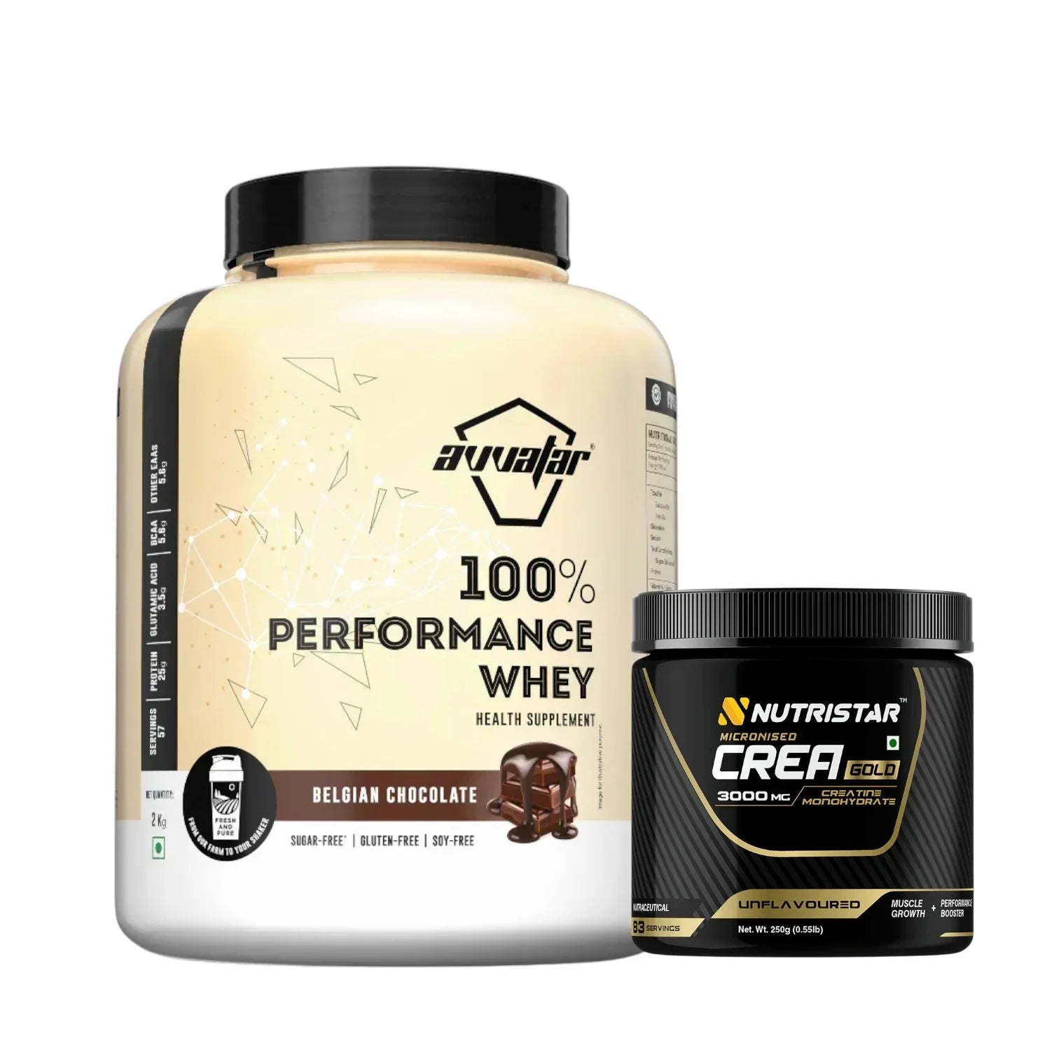Avvatar 100% Performance Whey 2 Kg + Nutristar Micronized CREA Gold Creatine Monohydrate 250g (83 Servings) - Endurance & Muscle Power Combo
