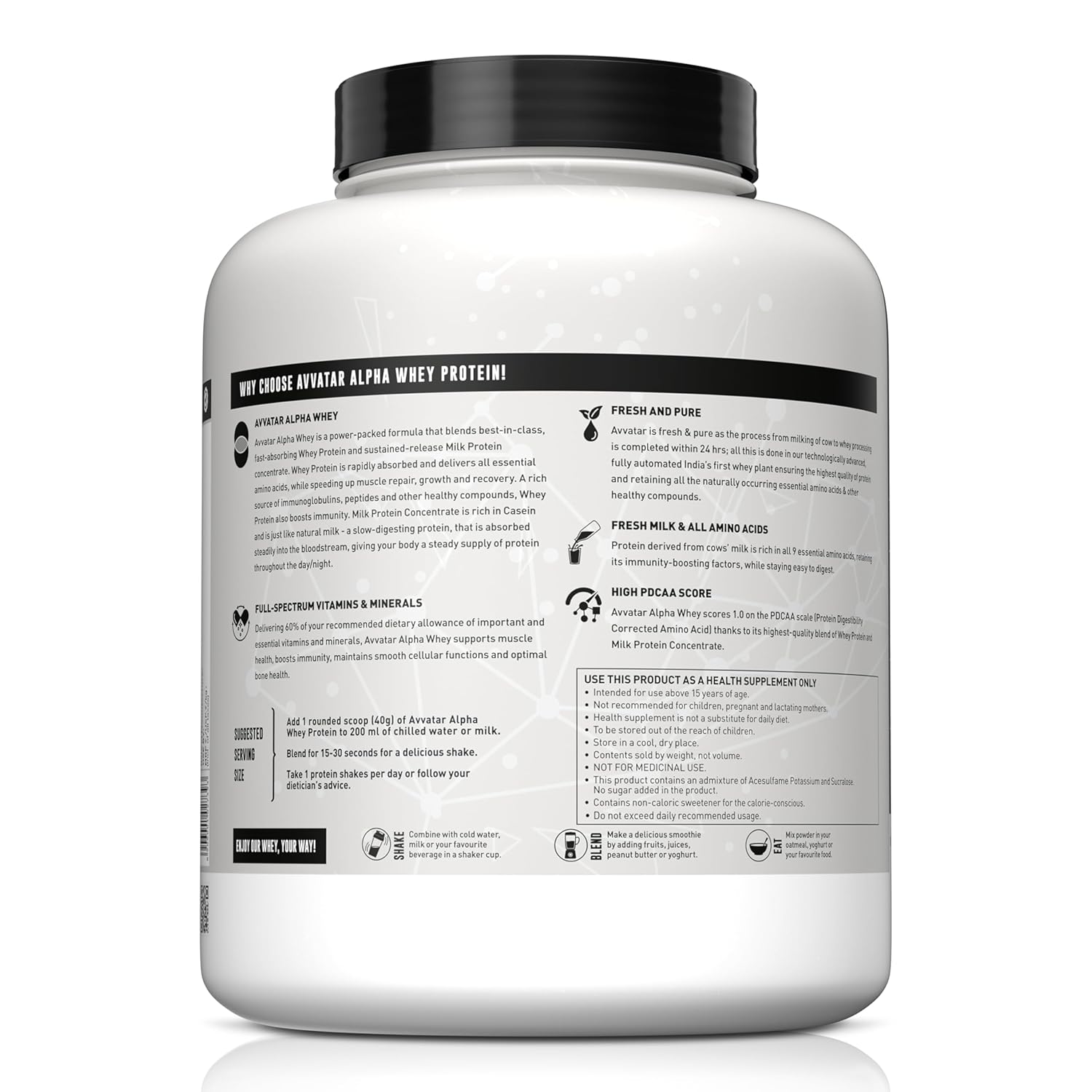 PREMIUM DUAL-PROTEIN FORMULA : Avvatar Alpha Whey Protein is a unique blend of fast-absorbing whey protein and slow-digesting milk protein rich in casein, designed to deliver both immediate and sustained muscle nourishment.
