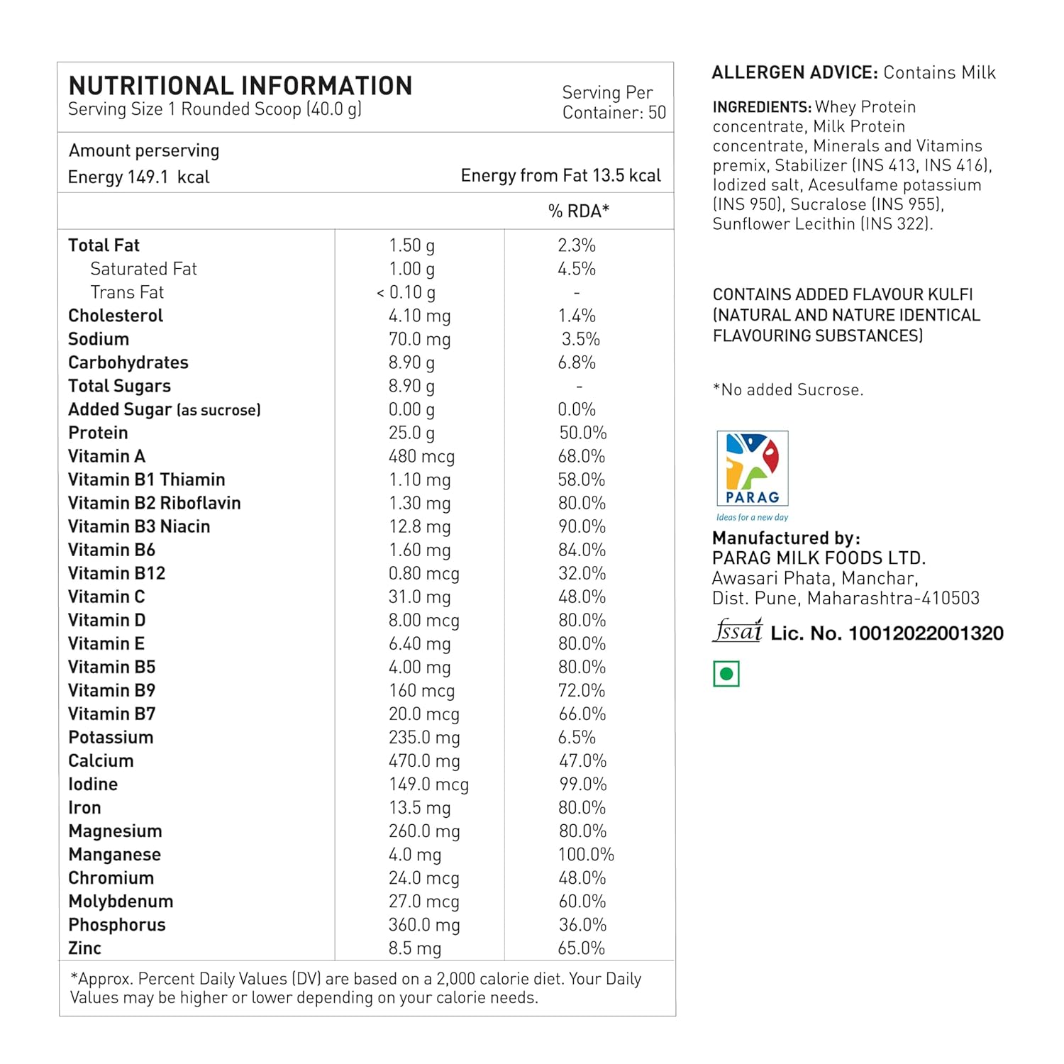 Parag Milk Foods Ltd., Awasari Phata, Manchar, Dist. Pune - 410503 Country of Origin : India