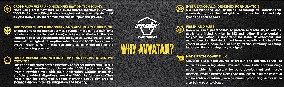 PURE & POWERFUL MUSCLE FUEL : Avvatar 100% Performance Whey Protein is loaded with essential amino acids that support muscle growth, recovery, and repair after intense workouts.