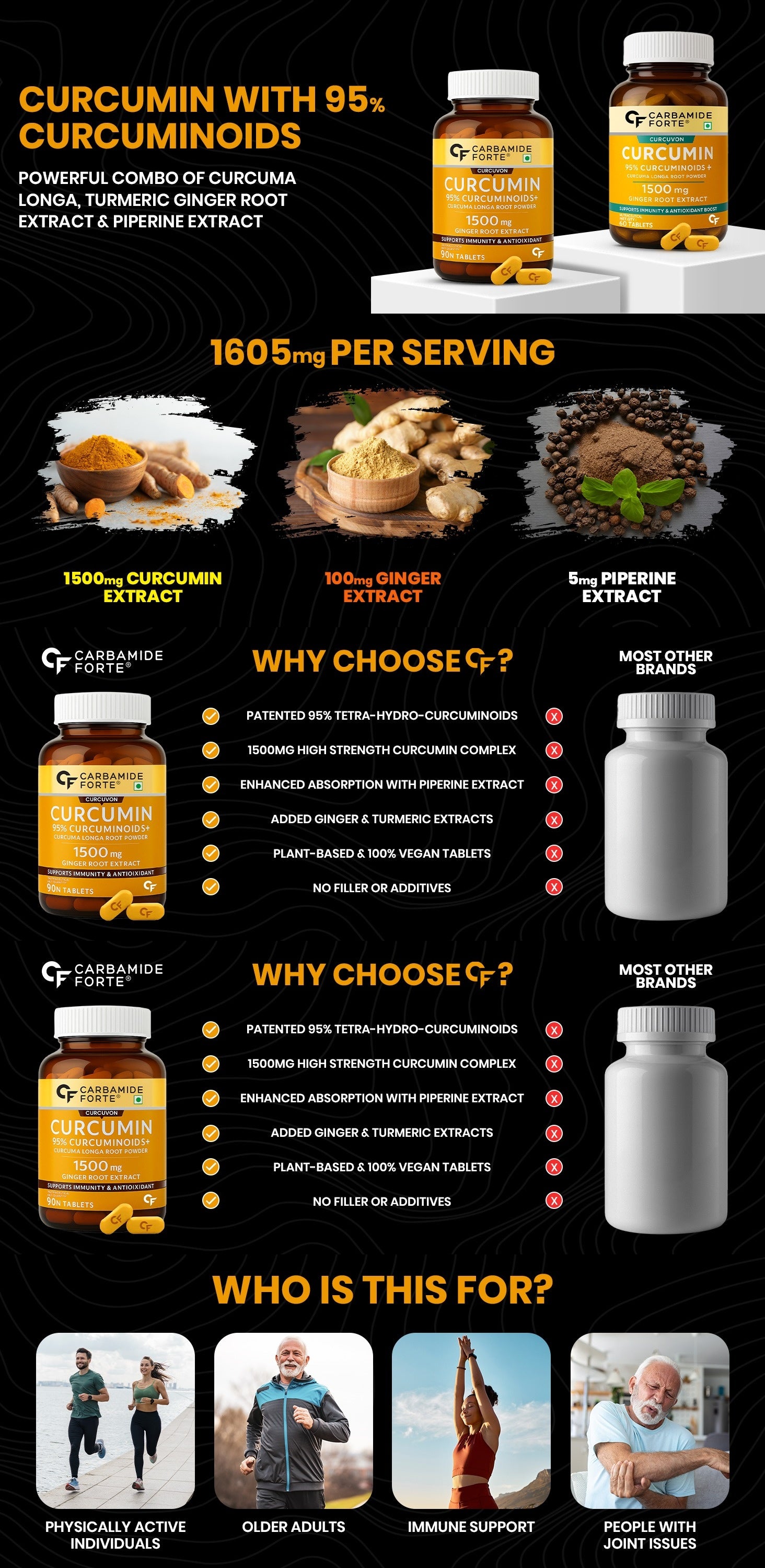 Carbamide Forte Curcumin 95% Curcuminoids with Piperine | Turmeric & Ginger Anti-Inflammatory | 90 Veg Tablets