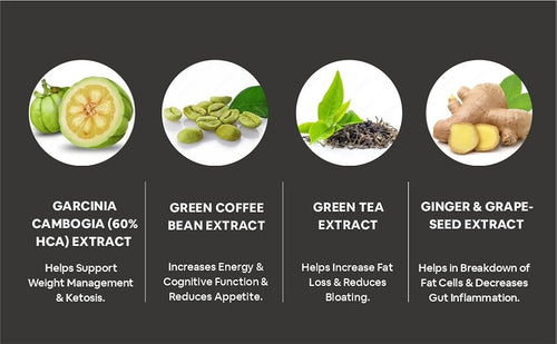 Features high-purity extracts including Garcinia Cambogia (95% HCA), Green Coffee Bean (50% CGA), Green Tea Extract (90% Polyphenols), Grape Seed Extract (95% Proanthocyanidins), and Piperine (95%).