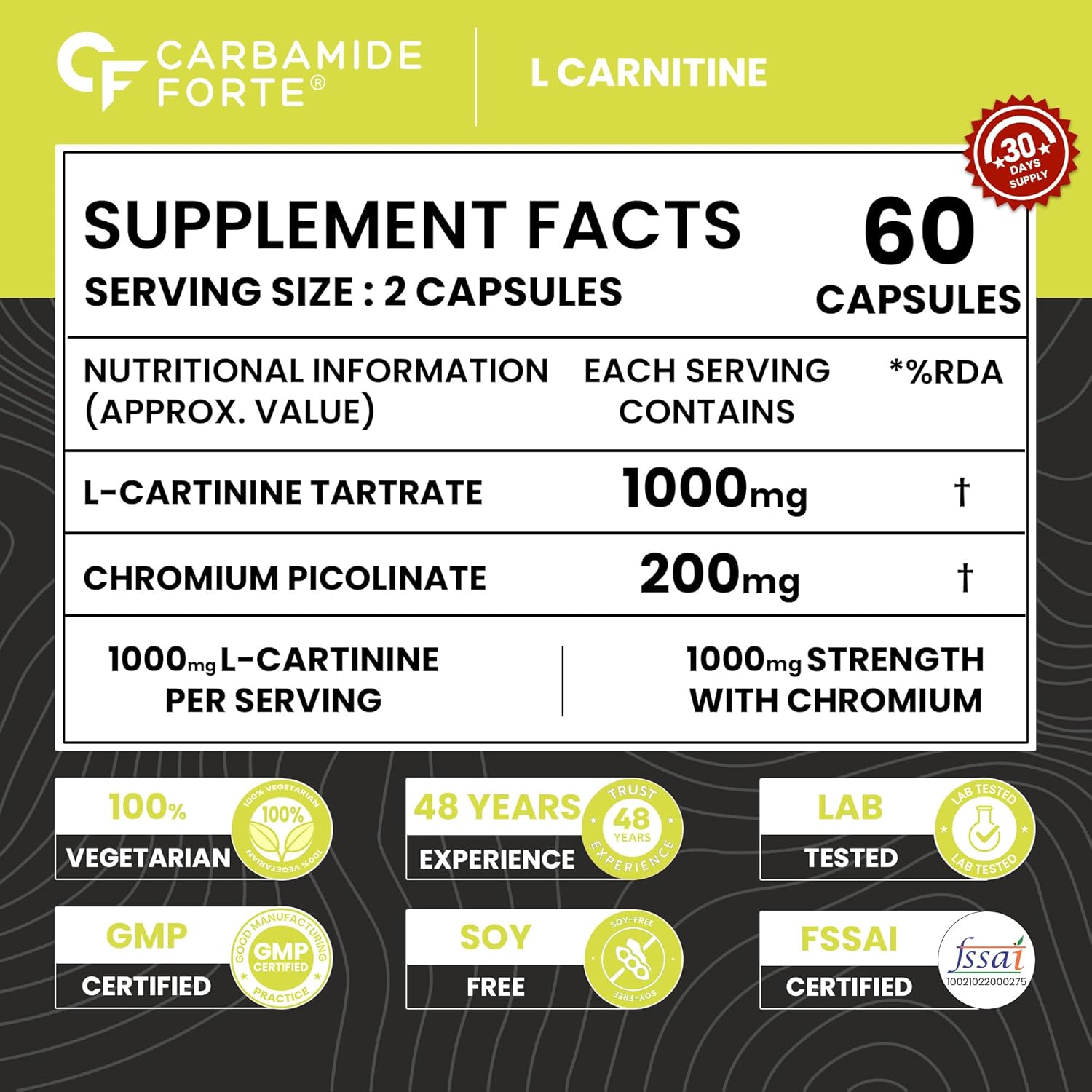This L-Carnitine supplement is a non-prescription dietary product designed to complement a healthy diet and active lifestyle. It does not claim to treat, prevent, or cure any medical condition.