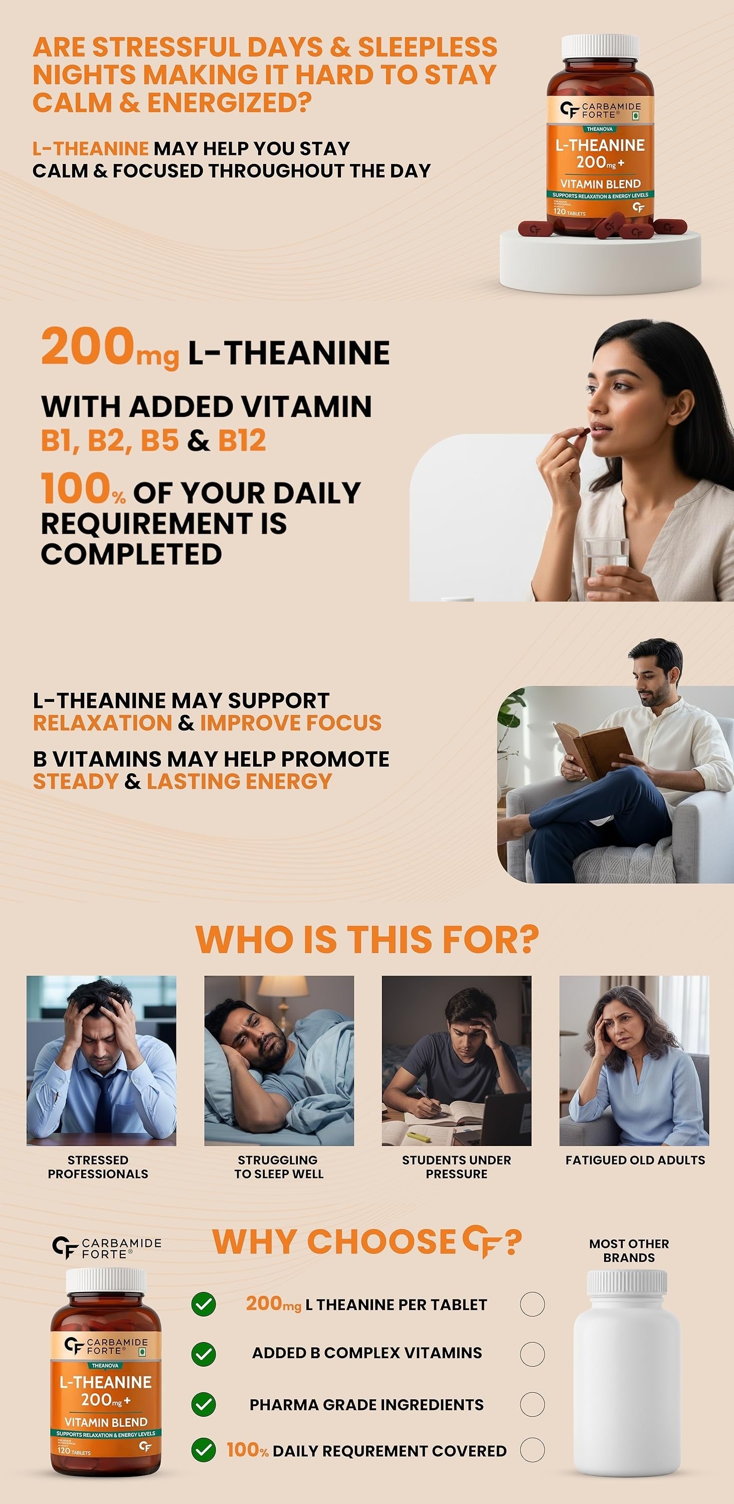 Carbamide Forte L-Theanine 200mg with Vitamin B Complex | Relaxation, Focus & Energy Formula | 120 Veg Tablets