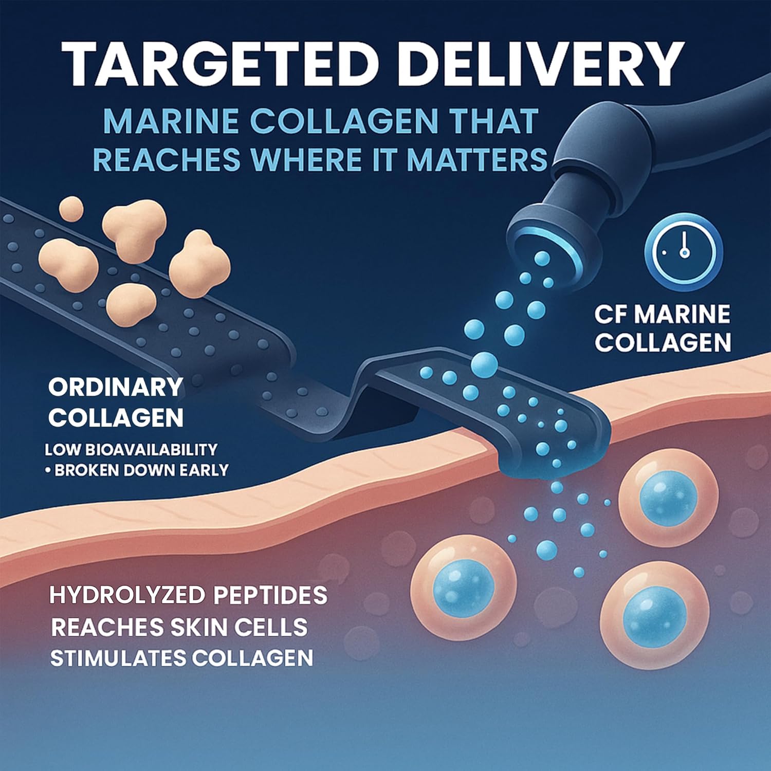 Formulated with highly bioavailable marine collagen peptides for rapid absorption. Supports skin health, hair strength, and nail resilience with easy digestion and efficient utilization.