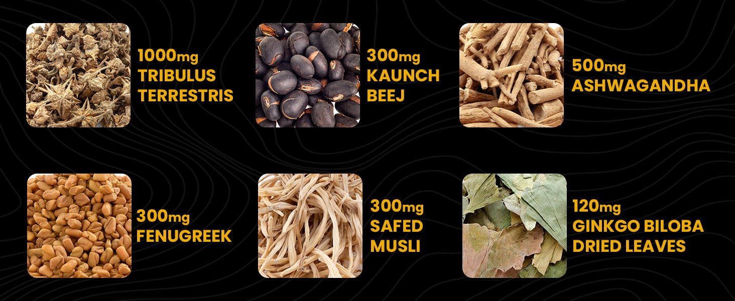 Formulated with Tribulus Terrestris, Kaunch Beej, Ashwagandha, Fenugreek Extract, Safed Musli Extract, Ginkgo Biloba Extract, and L-Citrulline—a comprehensive blend offering enhanced support for active men.