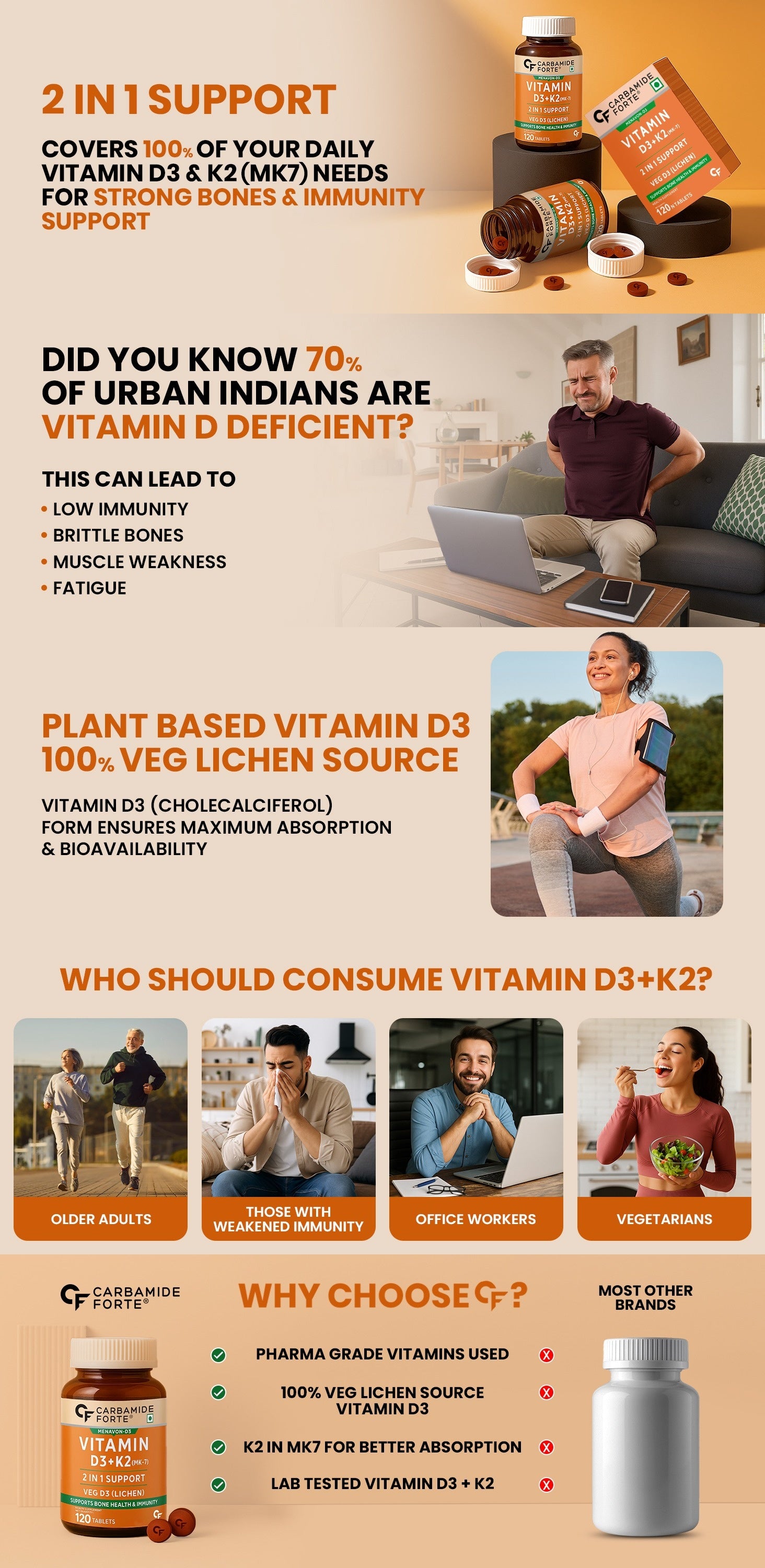 Carbamide Forte Vitamin D3 + K2 (MK7) | Bone & Heart Health Support with Lichen D3 | 120 Tablets