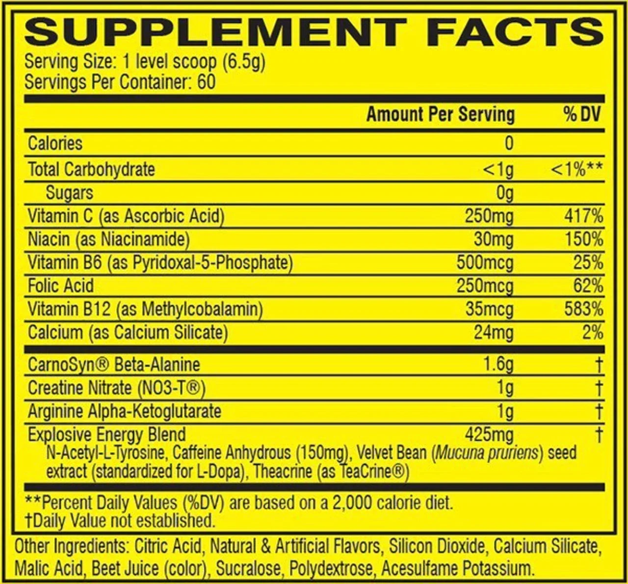 Mix 1 level scoop with 200-250ml of water & consume 15-30 min prior to exercise. Vary amount of liquid to taste. Do not exceed one serving per day.