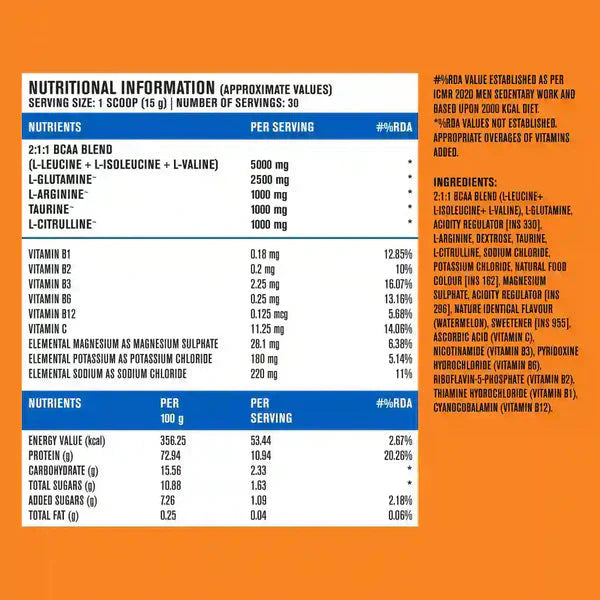 BCAA Intra-training has 5g of BCAA - L-Leucine, L-Isoleucine and L-Valine in ideal 2 : 1 : 1 ratio. It has an Added Muscle Activation Complex that consists of Glutamine, Taurine, L-Arginine and Citrulline and is made with Ultra-Granulation Technology for effective absorption into the bloodstream. It provides nitric oxide boost along with electrolytes and vitamins.