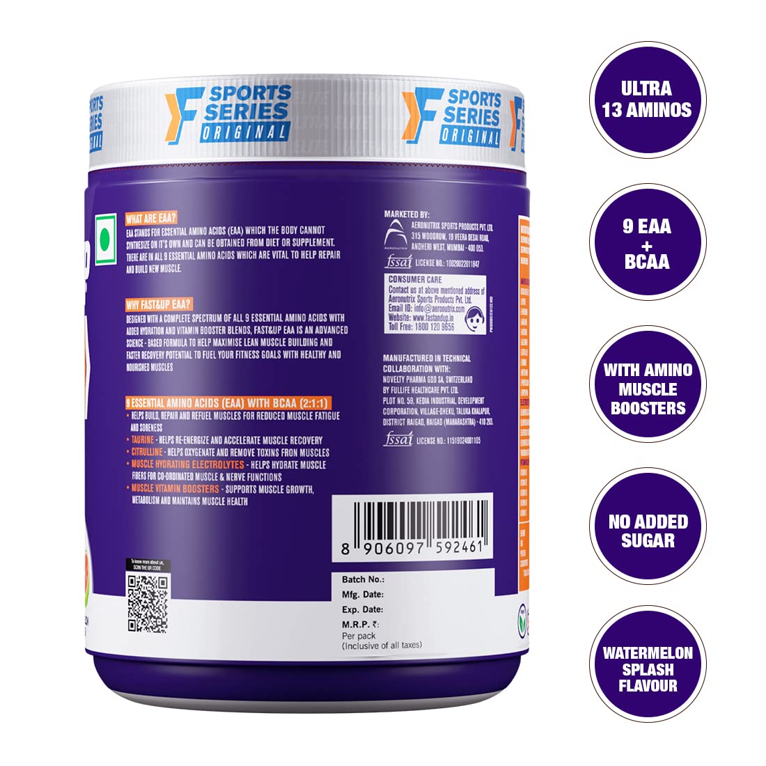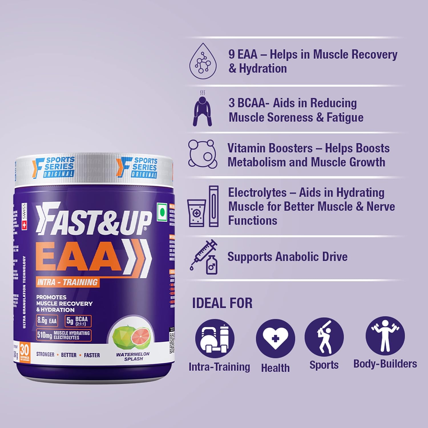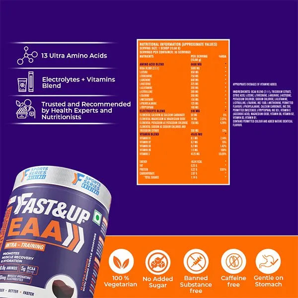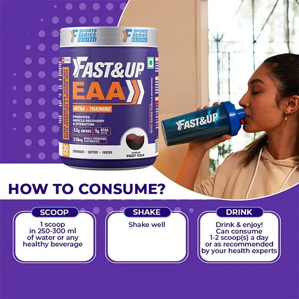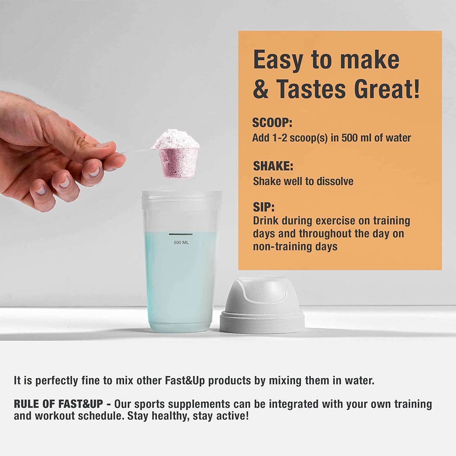 Mix one 13.98gm scoop of Fast&Up EAA Intra-Training with water and consume during your workout to enhance endurance and recovery. For optimal results, use consistently as part of your daily training routine.