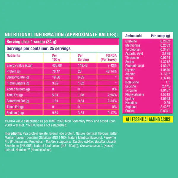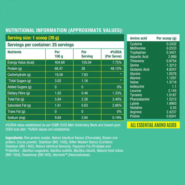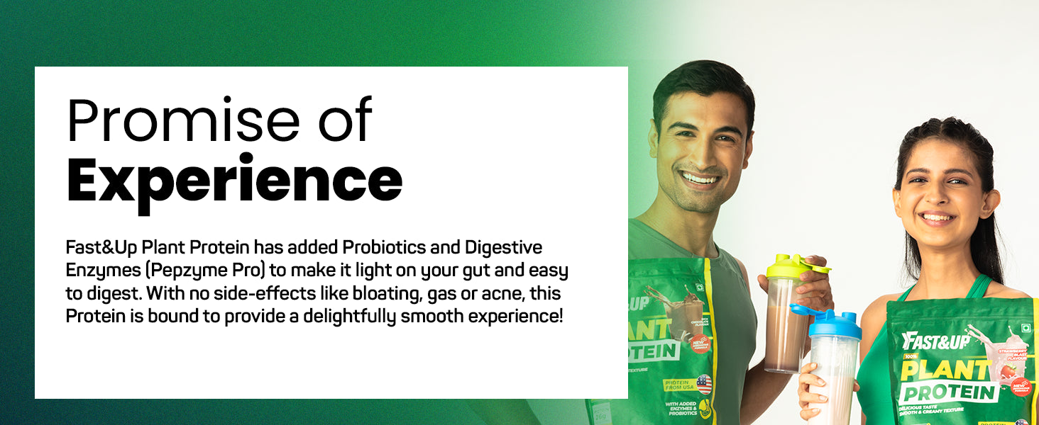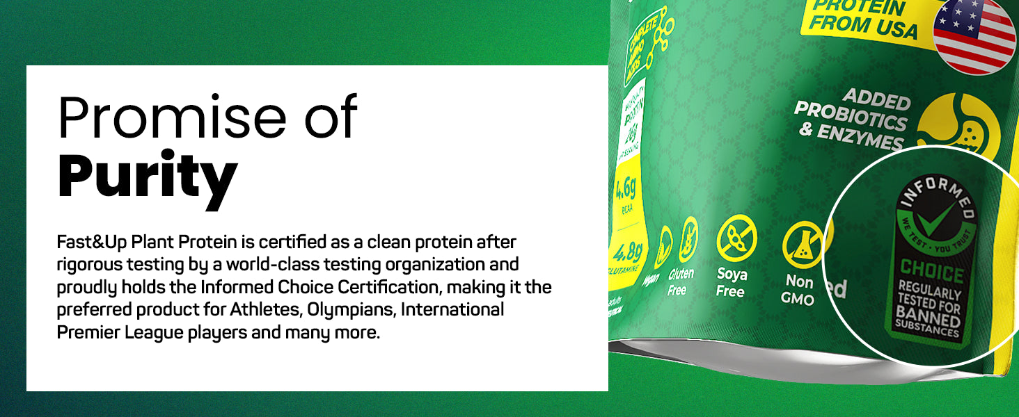 Fast&Up Plant Protein Powder now in a new innovative formula with premium quality 26g Plant Protein (Pea + Brown Rice Isolate) sourced from the USA with naturally occurring 4.6g BCAA & 4.8g Glutamine in every serving. It helps build lean muscle, strength and promotes muscle recovery.