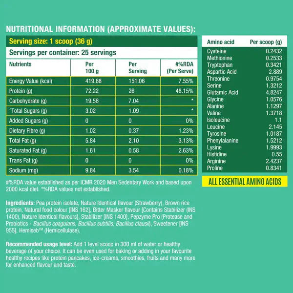 Fast&Up Plant Protein Isolate provides 100% Vegan Plant Based Protein powder sourced from USA and made from a blend of Pea Protein isolate and Brown Rice Protein isolate. It contains naturally occurring 4.6g BCAA and 4.8 g Glutamine, with added digestive enzymes and probiotics.