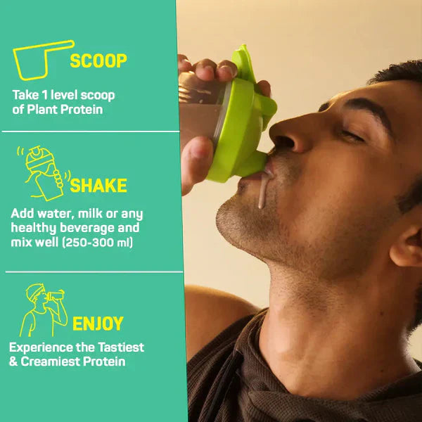 Take 1 Level Scoop of Plant Protein, Add to 250 - 300ml Water, Milk or any Beverage of your Choice, Tastiest and Creamiest Protein.