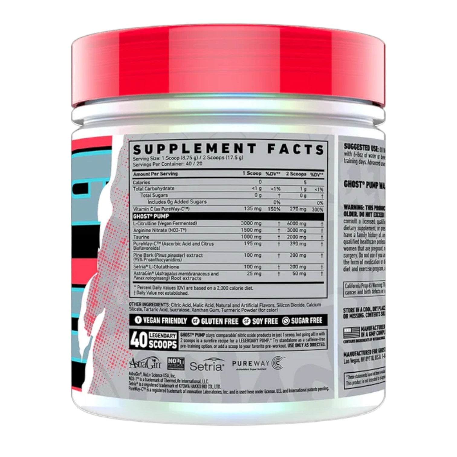 Mix one scoop (1 serving) of GHOST® PUMP with 6-8 oz of water or beverage of choice, such as GHOST LEGEND®, 30 minutes before exercise on training days. Advanced users/users over 160lbs, mix 1-2 scoops with 10-12oz of water prior to training.