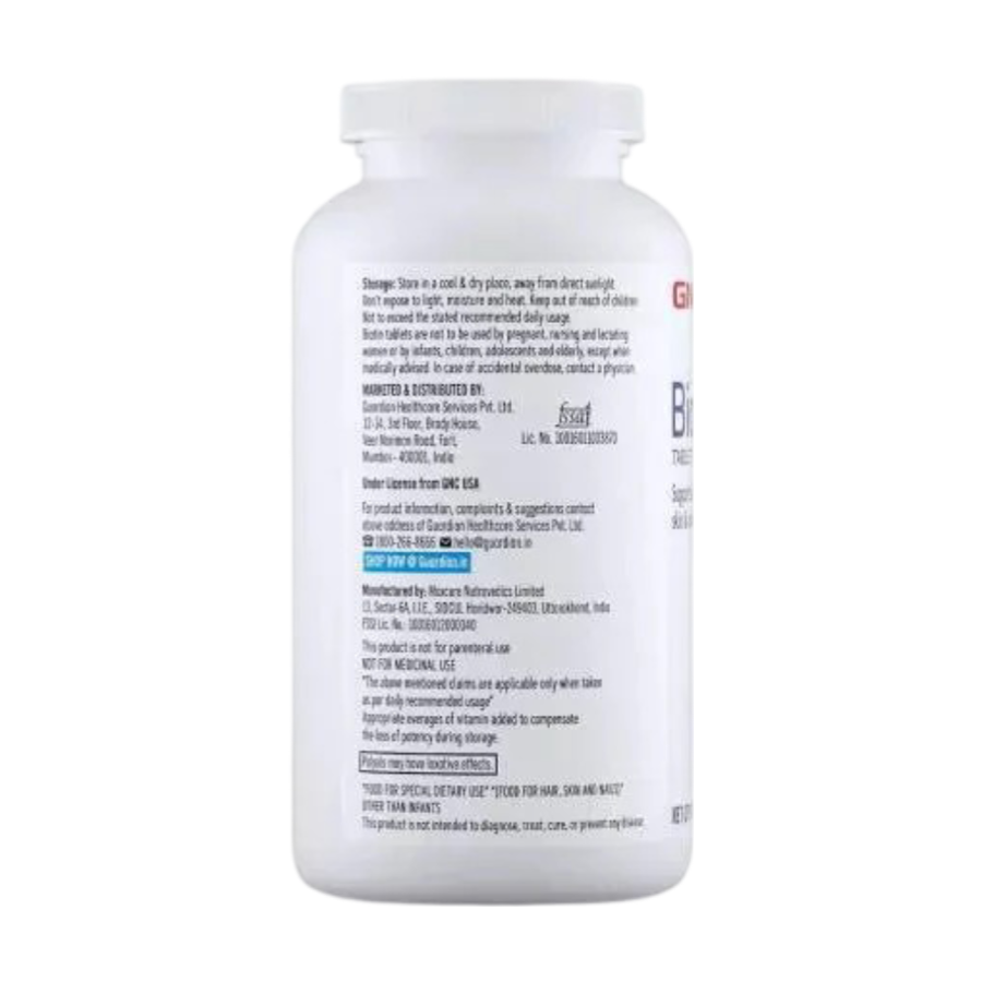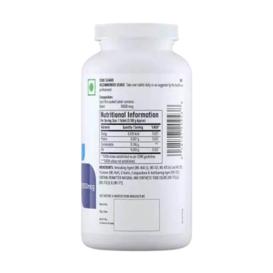 Biotin 10000 mcg, Anticaking Agent [INS 460 (i), INS 421 and INS 551], Disintegrant (Crospovidone), Thickener [INS 464], Anti sticking agent [INS 470(iii), Sodium Stearyl Fumarate, Colours [INS 172(iii), INS 172 (ii), and INS 171] and Antifoaming Agent [INS 1521].