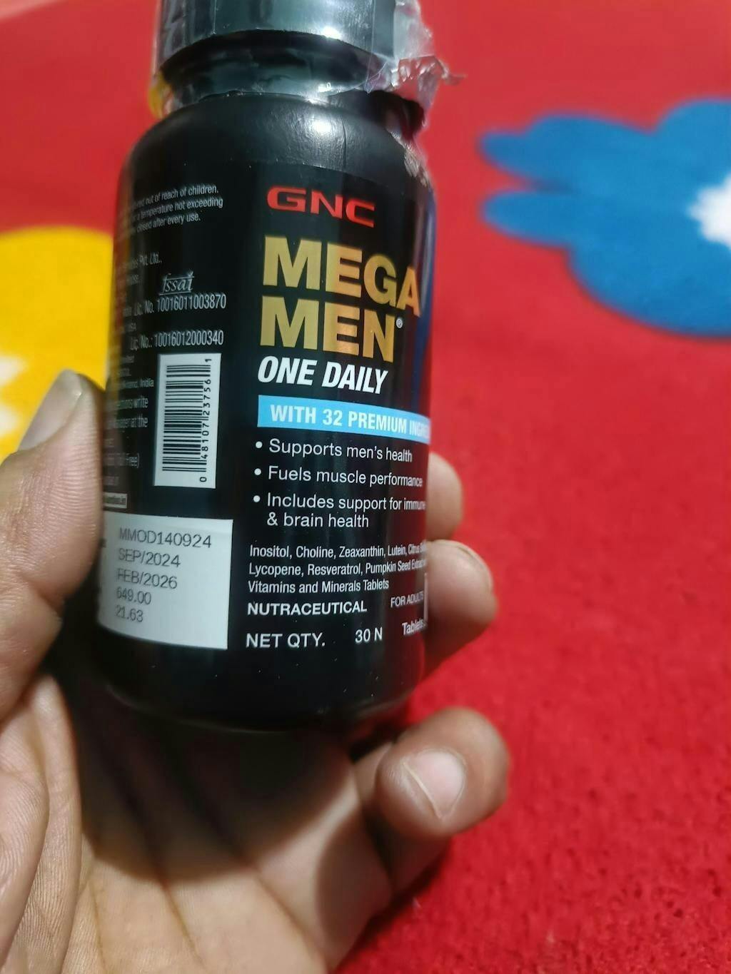 GNC Mega Men One Daily Multivitamin is ideal for adult between the age 19 years and 50 years to help support their daily nutritional needs. One tablet a day is enough to meet your daily nutrient requirement and is helpful in supporting metabolism and natural wear and tear of muscles.