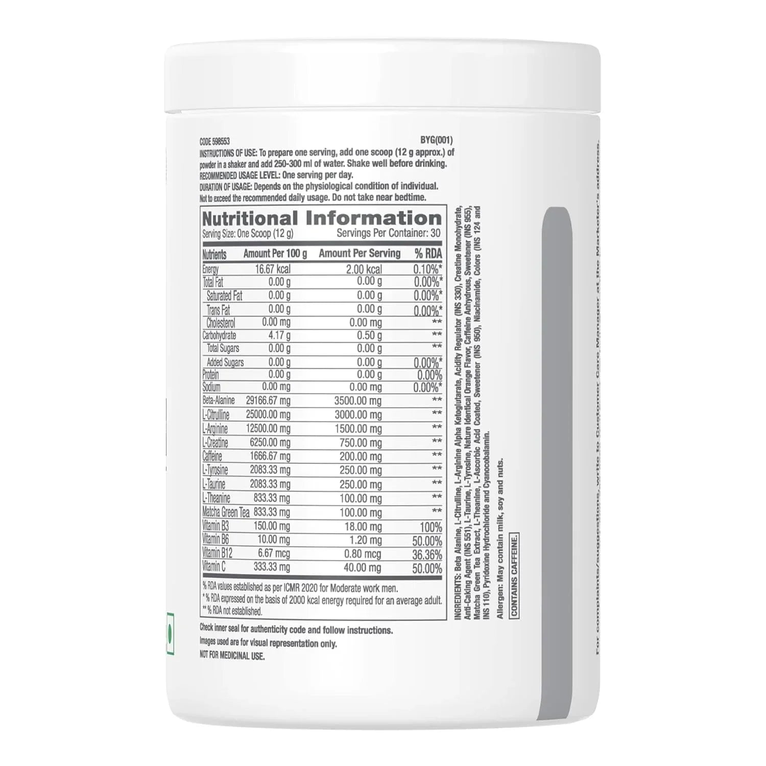 Beta Alanine, L-Citrulline, L-Arginine Alpha Ketoglutarate, Acidity Regulator (INS 330), Creatine Monohydrate, Maltodextrin Powder, Anti Caking Agent (INS 551), Caffeine, L-Taurine, L-Tyrosine, Sweetener (INS 955), Matcha Green Tea Powder, L-Theanine, L-Ascorbic Acid Coated, Sweetener (INS 950), Niacinamide, Pyridoxine Hydrochloride, Colour (INS 133/INS 124 & INS 110), and Cyanocobalamin.
