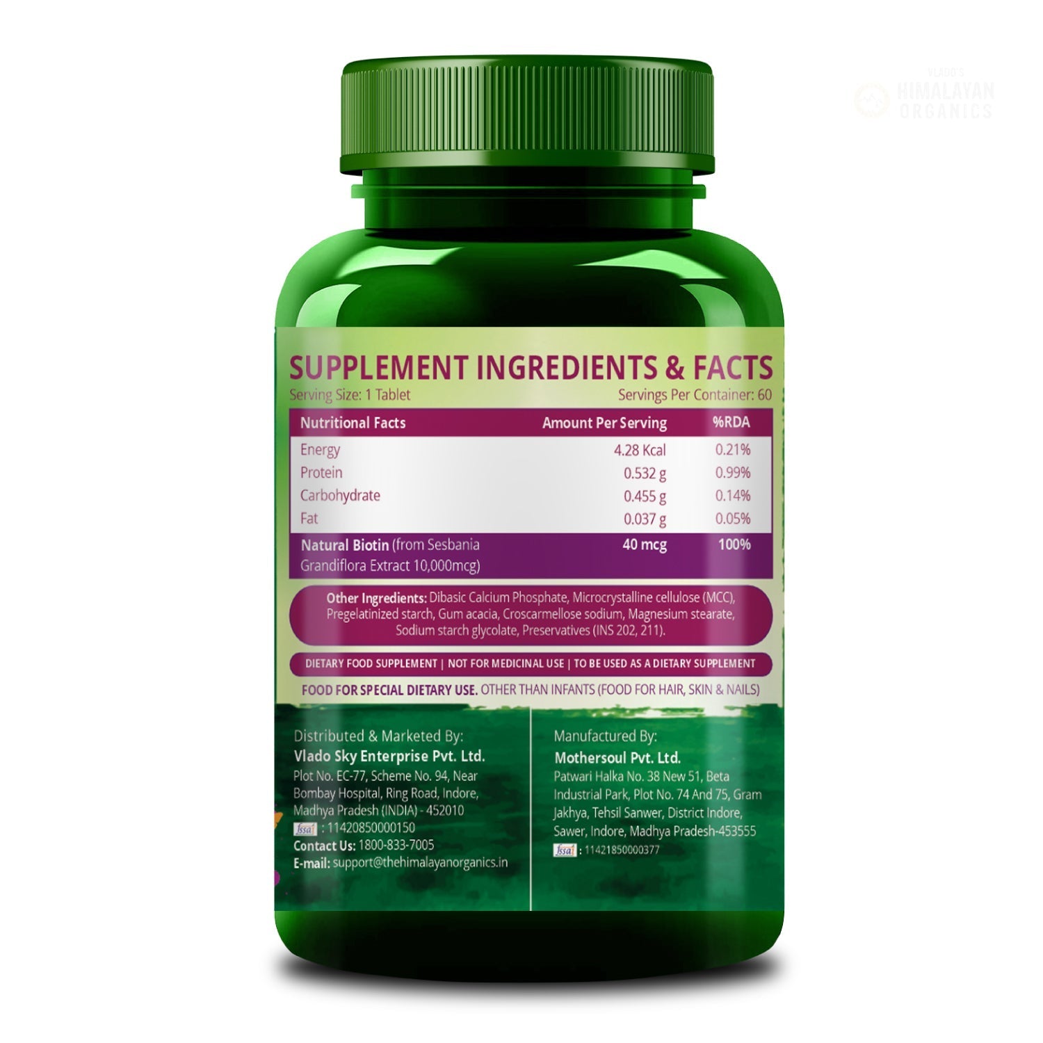 Experience the power of Sesbania Grandiflora-derived biotin with Vlado’s Himalayan Organics Biotin 10,000 mcg. This plant-based supplement supports healthier hair, improves skin texture, and strengthens nails. With 60 tablets per bottle, it delivers an effective dose of biotin to help you achieve healthier hair from within, promote radiant skin, and enhance nail strength.