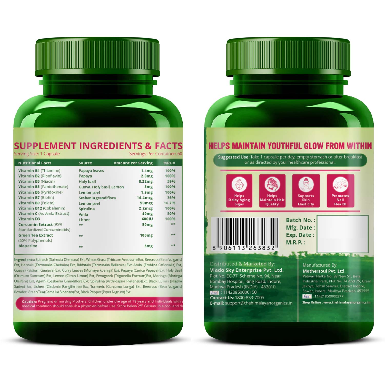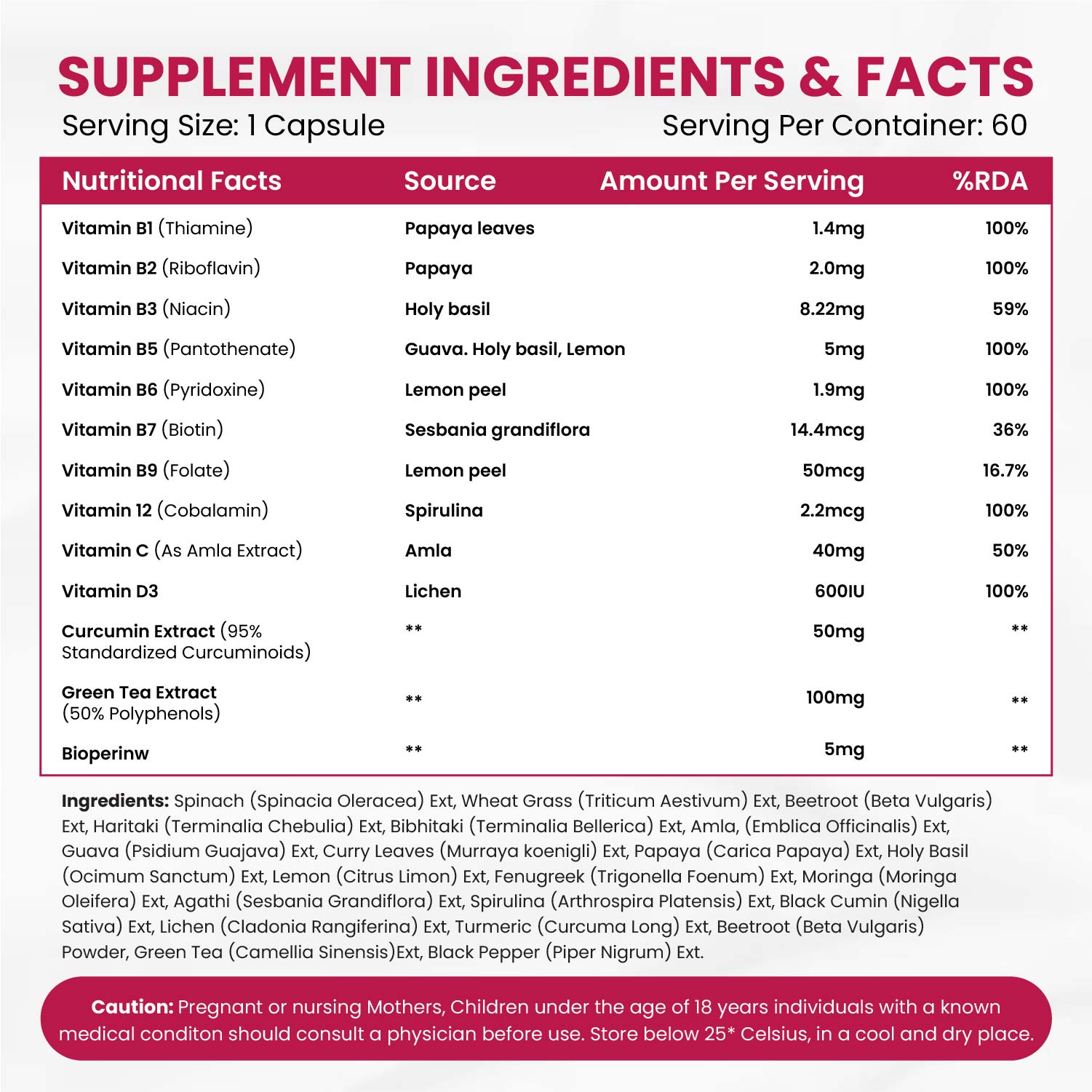 Folate, Biotin, Vitamin C, Zinc, Selenium, Potassium, Sodium, Other Ingredients(Sea Buckthorn, Sesbania Grandiflora leaves, Green Amla, Acai berry, Spirulina, Barley Grass, Acerola Cherry, Green Tea, Lemon, Rose Petal, Guava, Pomegranate, Orange Peel, Tulsi Leaves, Bamboo Shoot, Spinach, Black Salt, Cinnamon & Green Ginger).