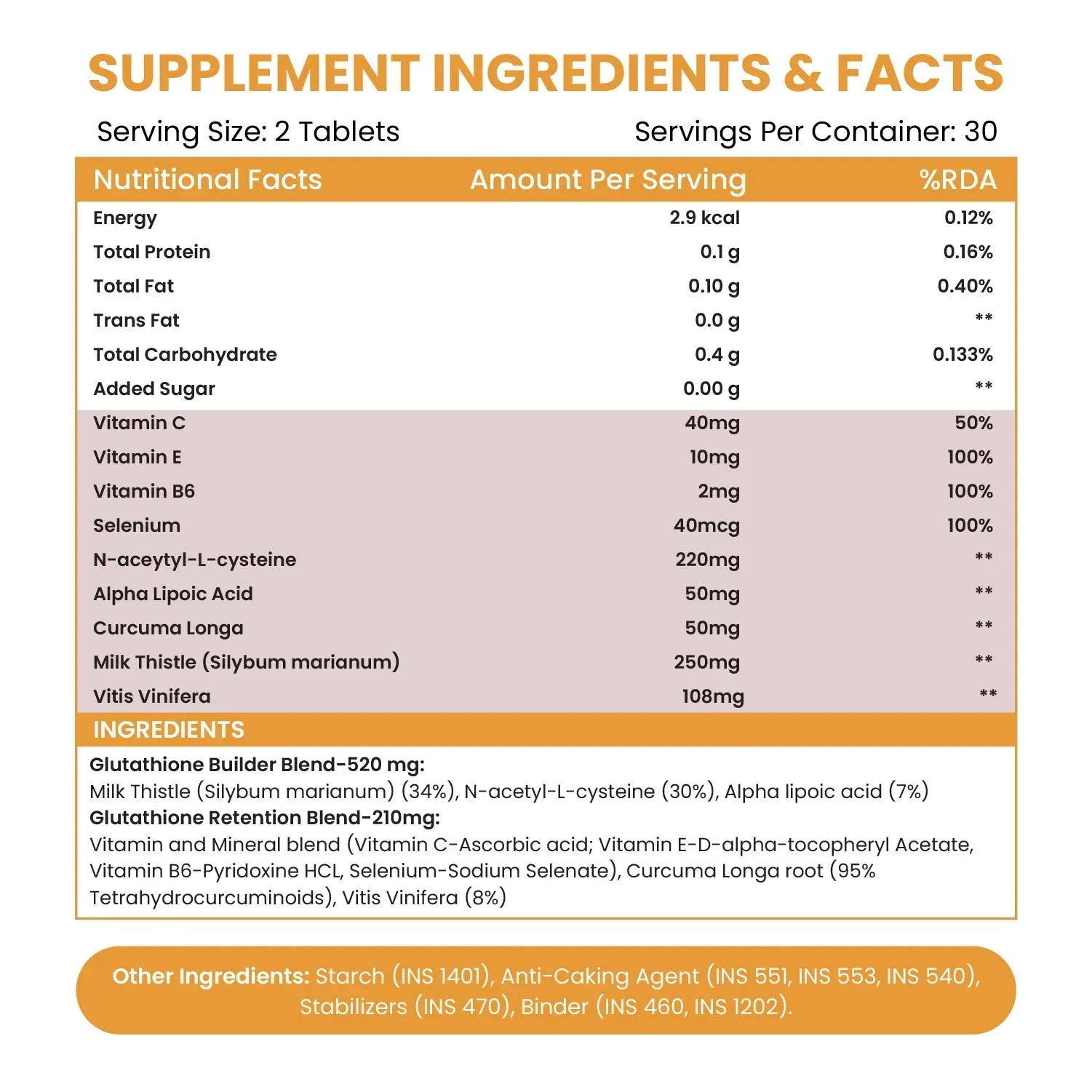 Energy,Total Protein,Total Fat,Trans Fat,Total Carbohydrate,Added Sugar,Vitamin C,Vitamin E,Vitamin B6,Selenium,N-acetyl-L-cysteine,Alpha Lipoic Acid,Glutathione Builder Blend((Silybum Marianum Aerial Part Extract (34%), N-acetyl-L-cysteine(30%), Alpha Lipoic Acid(7%)),Glutathione Retention Blend,Vitamins & Minerals Blend (Vitamin C - Ascorbic Acid, Vitamin E - DL - Alpha-tocopheryl Acetate, Vitamin B6 - Pyridoxine HCL, Selenium-Sodium Selenite), Curcuma Longa Root (95% Tetrahydrocurcuminoids) Extract (10%), Vitis Vinifera Seed Extract (8%)),Starch (INS 1401), Anti-Caking Agent (INS 551, INS 553, INS 540),Stabilizers (INS 470), Binder (INS 460, INS 1202).