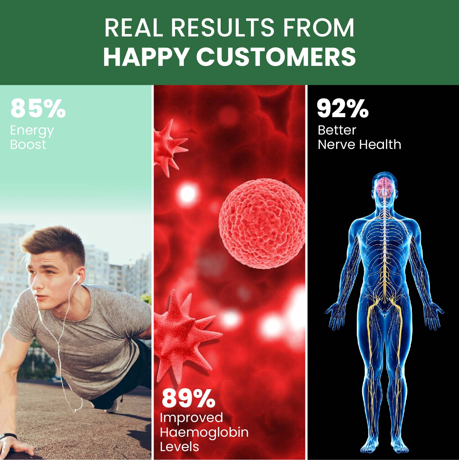 Vitamin B1, Vitamin B2, Vitamin B3, Vitamin B5, Vitamin B6, Vitamin B7, Vitamin B9, Vitamin B12, Other Ingredients{Propreitary Blend of(wheatgrass powder, barley grass, spirulina , moringa leaves, alfalfa leaves, spinach leaves, beetroot, sweet potato, pumpkin, ginger, lichen, fenugreek leaves, Vegetable capsule shell & stevia leaves)}.