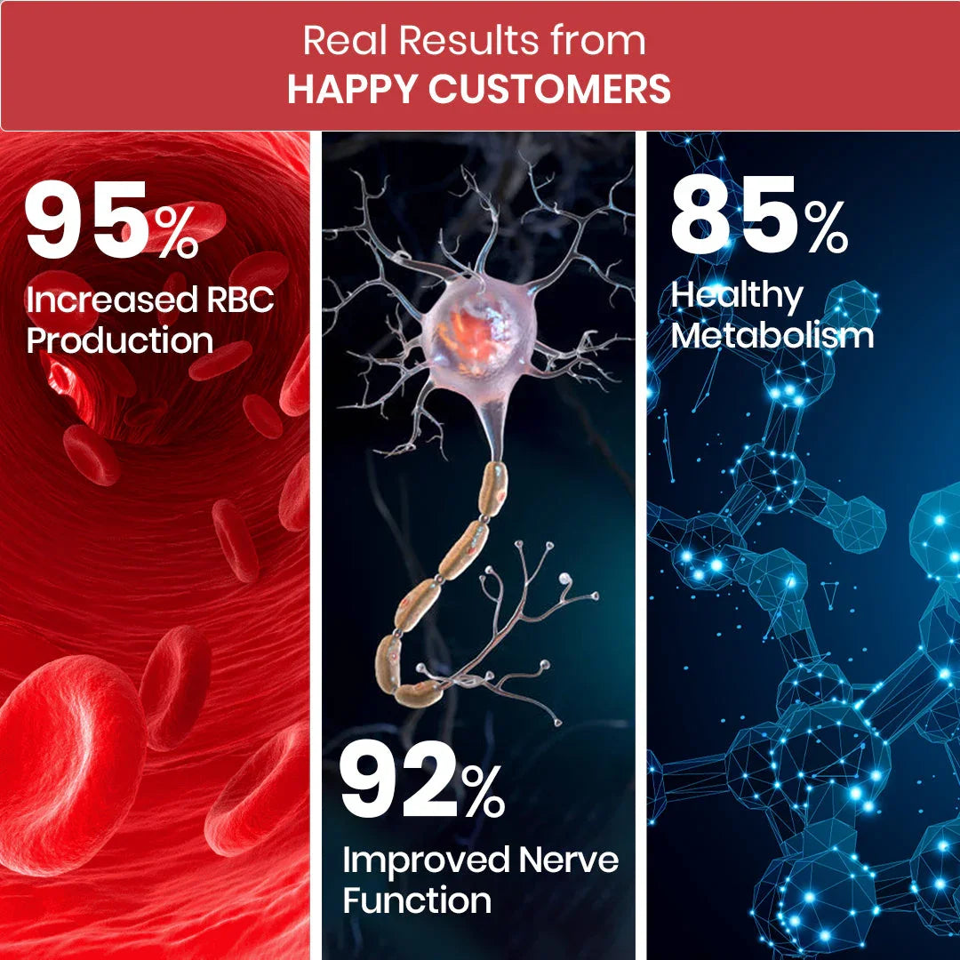 Revitalize your body and **boost your energy** as this complex supports the **production of red blood cells**, essential for oxygen transport. It promotes a **strong immune system**, helping your body defend against daily challenges, and **improves metabolism**, ensuring efficient energy conversion from food.