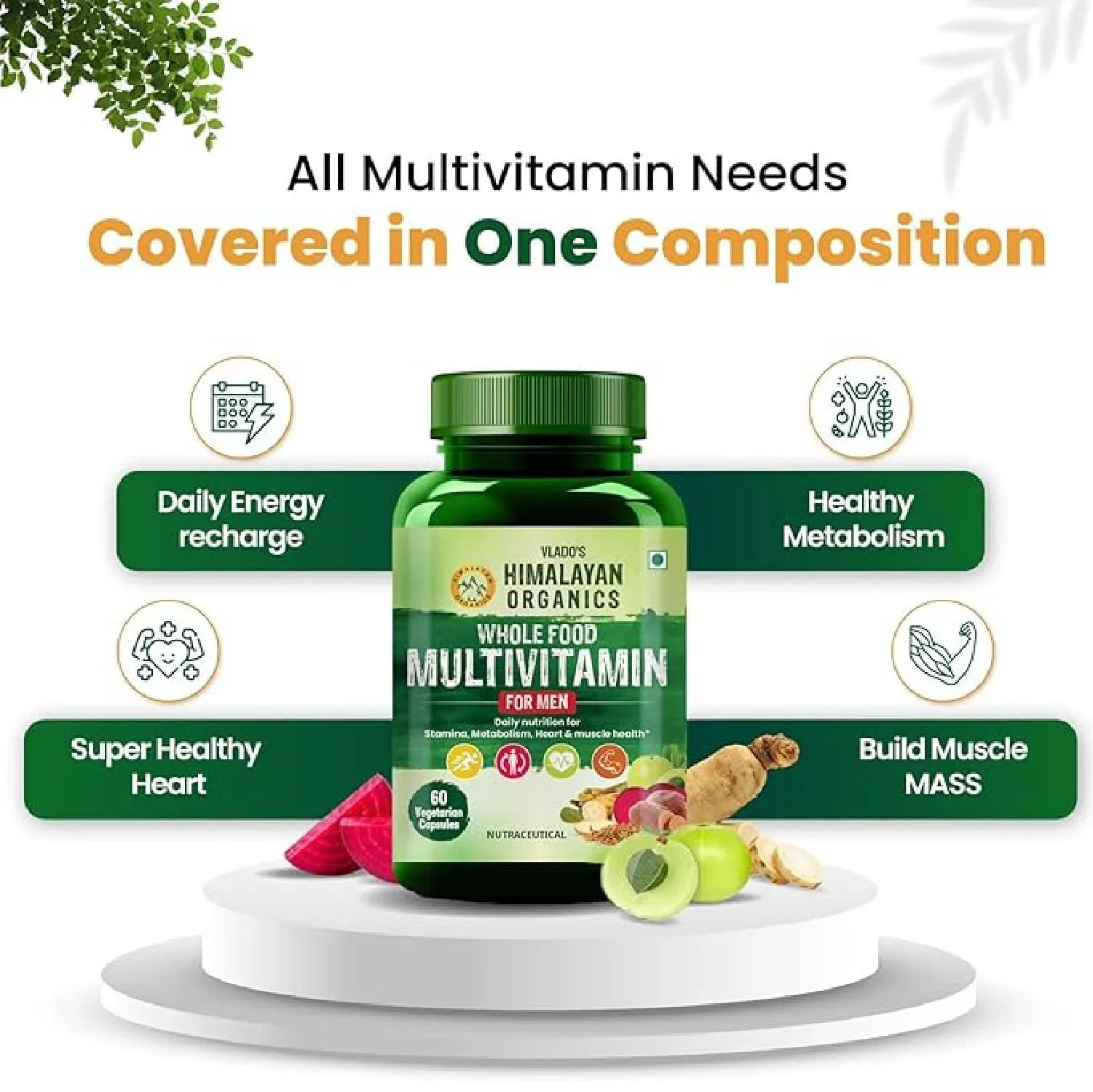 Stay active and energized with Vlado’s Himalayan Organics Whole Food Multivitamin for Men. Formulated with essential vitamins, minerals, and herbal extracts, this daily supplement supports energy levels, immune function, and overall well-being. Infused with powerful antioxidants, prebiotics, and probiotics, it helps maintain gut health, brain function, heart wellness, and eye care. A simple addition to your daily routine to help meet nutritional needs. This multivitamin blend is packed with essential nutrients and herbal extracts to help maintain stamina, muscle strength, and endurance. With ingredients like Ashwagandha, Korean Red Ginseng this supplement supports energy metabolism, heart function, and mental clarity, making it an ideal daily choice for men looking to maintain a well-balanced routine. This carefully formulated whole food multivitamin delivers a blend of key vitamins, minerals, and herbal extracts to support cognitive function, cardiovascular health, and vision wellness. Rich in B-complex vitamins, Omega fatty acids, and antioxidants, it helps maintain mental sharpness, heart vitality, and eye nourishment, providing essential nutrients for overall wellness. Packed with Vitamin A, C, D, E, Zinc, and Iron, this multivitamin supplement helps maintain a healthy immune system and supports natural defense mechanisms. With prebiotics, probiotics, and digestive enzymes, it also helps maintain gut health while promoting better nutrient absorption for daily wellness. This multivitamin for men includes adaptogenic herbs like Ashwagandha and Ginseng, known for their role in stress management and endurance. The blend also contains B vitamins and antioxidants, which help support cognitive clarity, relaxation, and sustained energy throughout the day.