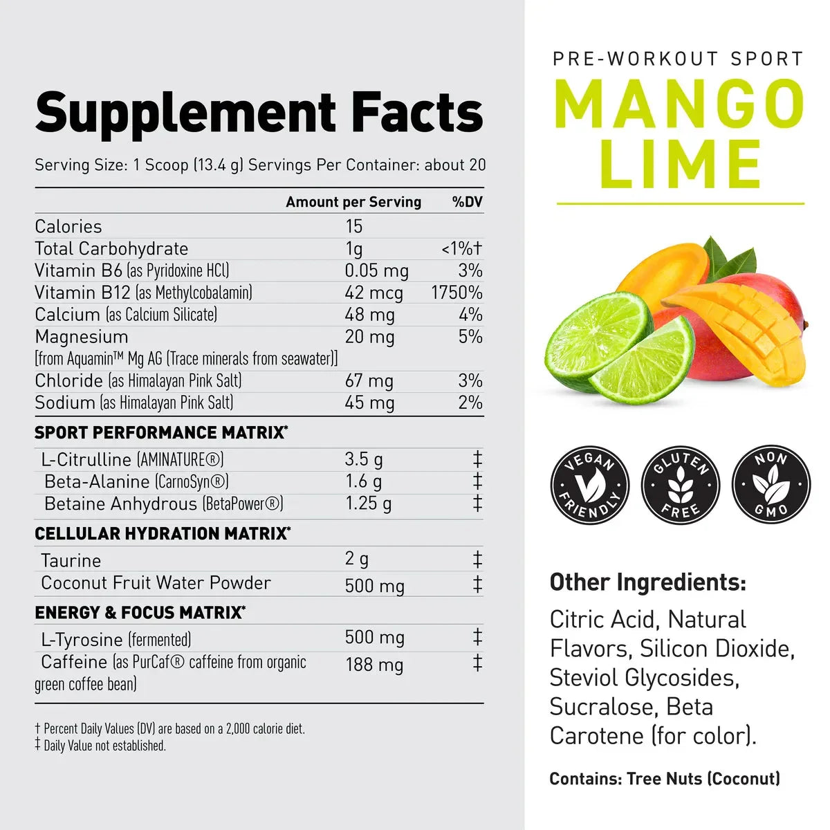 L-Citrulline, L-Leucine, L-Isolecuine, L-Valine, Betaine Anhydrous, Beta Alanine, Creatine HCL, Coconut Water Powder, Taurine, N-Acetyl-L-Tyrosine, L-Tyrosine, Organic Caffeine, Natural Flavor, Citric Acid, Organic Beet Root, Calcium Silicate, Silicon Dioxide, Sucralose, Tartaric Acid, Steviol Glycosides, Beet Root (Color)