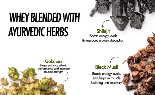 WHEY ISOLATE & CONCENTRATE BLEND derived from Dadhi Mastu Extract (Butter Milk) 30.5g, Pomegranate Extract (Punica granatum) Fr. 100mg, Gokshura Extract (Tribulus terrestris) Fr. 45mg, Kapikacchu Extract (Mucuna pruriens) Sd. 45mg, Black Musli Extract (Curculigo orchioides) Rt. 45mg, Bala Extract (Sida cordifolia) Rt. 25mg, Vidarikand Extract (Pueraria tuberosa) Rt. 25mg, Kutaki Extract (Picrorhiza kurroa) Rz., Lf., Bk. 25mg, Mariccha Extract (Piper nigrum) Fr. 10mg, Minerals: Resin of: Shilajit (Asphaltum punjabianum) Exd. 250mg, Excipients: Xanthan Gum Q.S., Carragenan Q.S., Guar Gum Q.S., Sucralose Q.S., Digezyme Q.S., Probiotic Blend Q.S., Cocoa Powder Q.S., Salt, Cookies Crumbs Q.S., Milk Solids Q.S. Flavour: Cookies and Cream Flavour Q.S. CONTAINS SUCRALOSE. ALLERGEN INFORMATION: Contains Milk