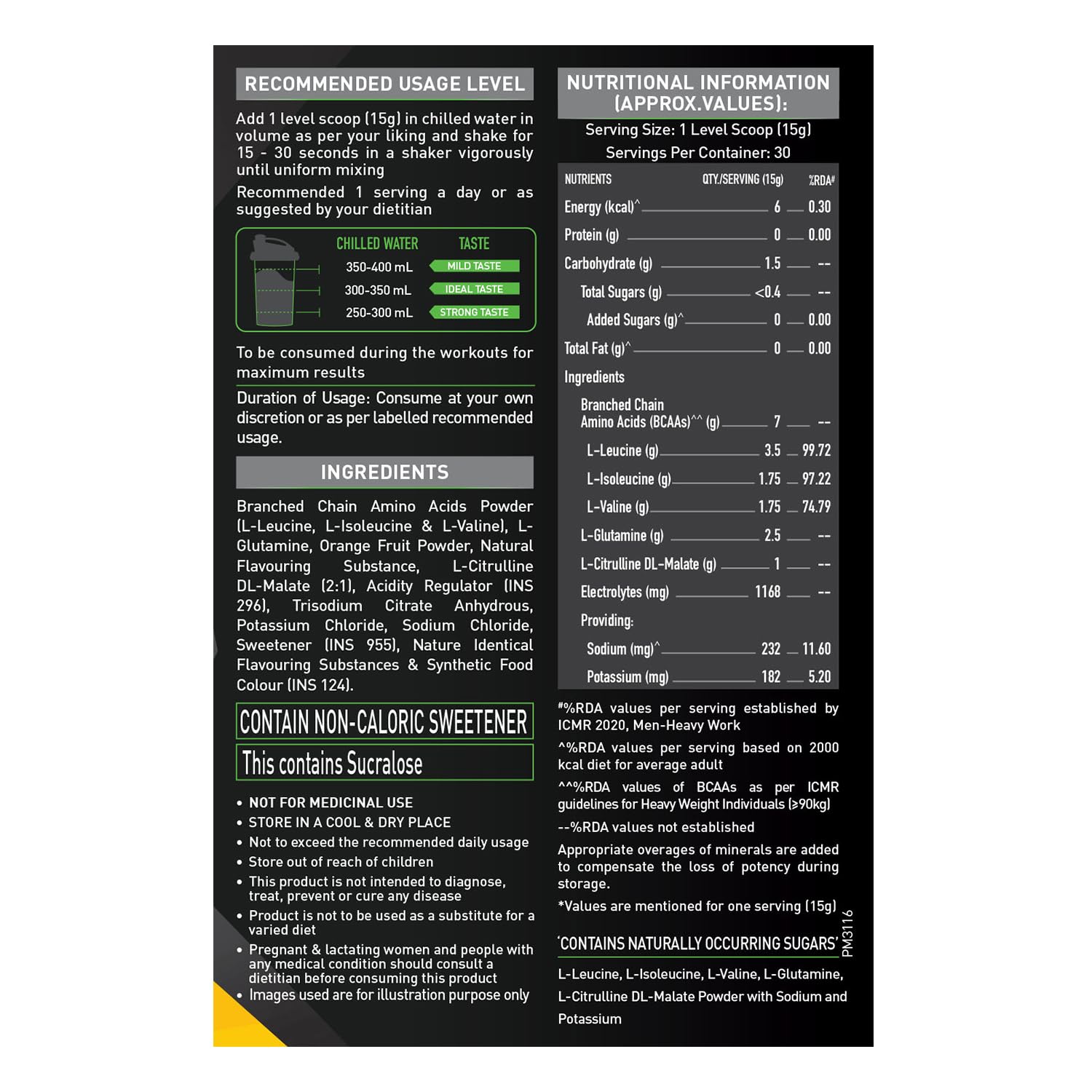 Branched Chain Amino Acids Powder (L-Leucine, L-Isoleucine, L-Valine), L-Glutamine , Pineapple Fruit Powder , L-Citrulline DL-Malate, Acidity Regulator (INS 330), Trisodium Citrate Anhydrous, Potassium Chloride, Sodium Chloride & Sweetener (INS 955), PERMITTED NATURAL, COLOURS (INS 101 & INS 162) AND ADDED FLAVOURS