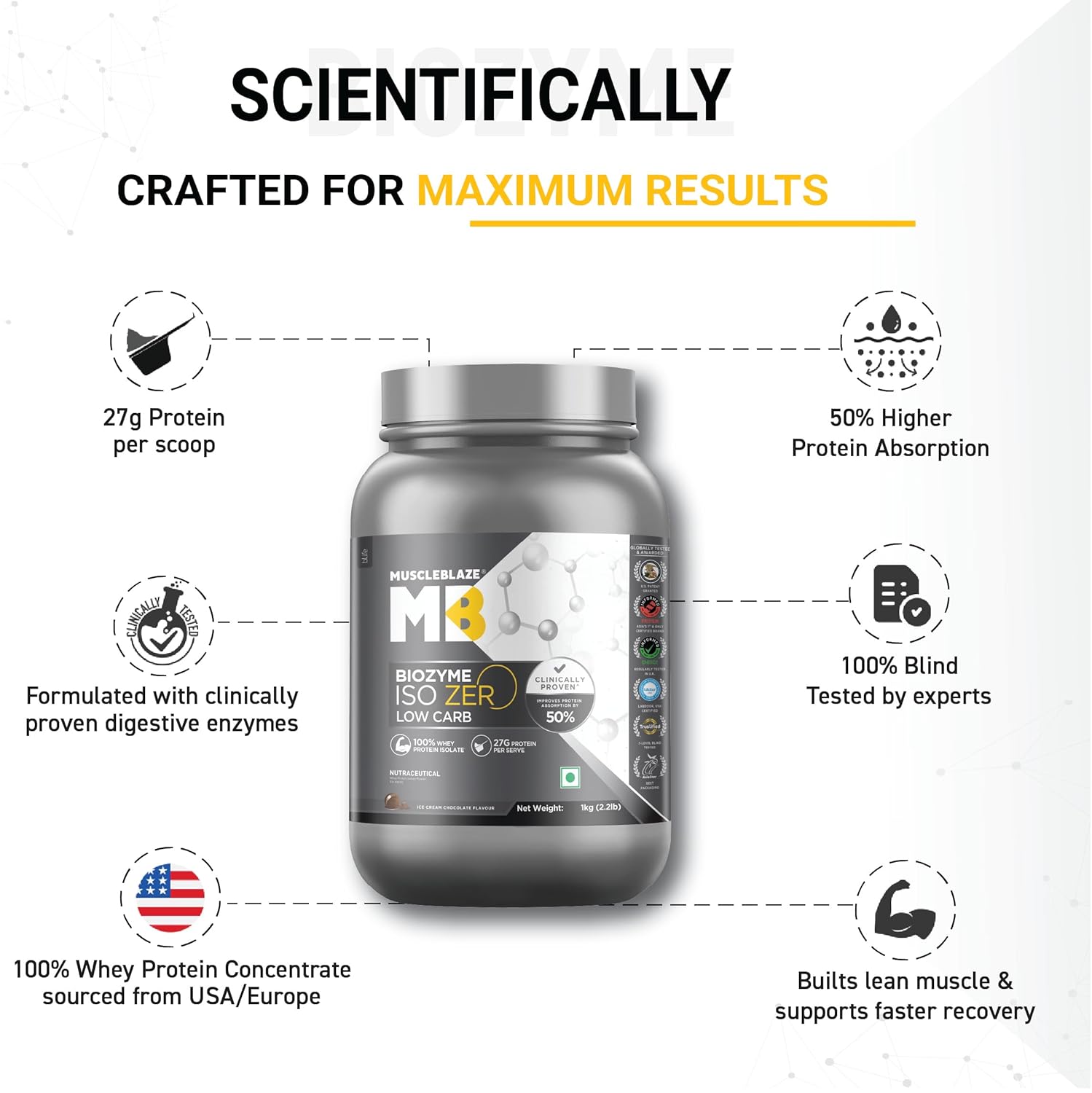 Premium Zero/Low Carb Whey Isolate : MuscleBlaze Biozyme Iso Zero is India’s leading ultra-purified whey protein isolate, delivering 100% of It's protein from Whey Isolate Ideal for advanced athletes and fitness enthusiasts seeking lean muscle gains without added carbs or lactose.