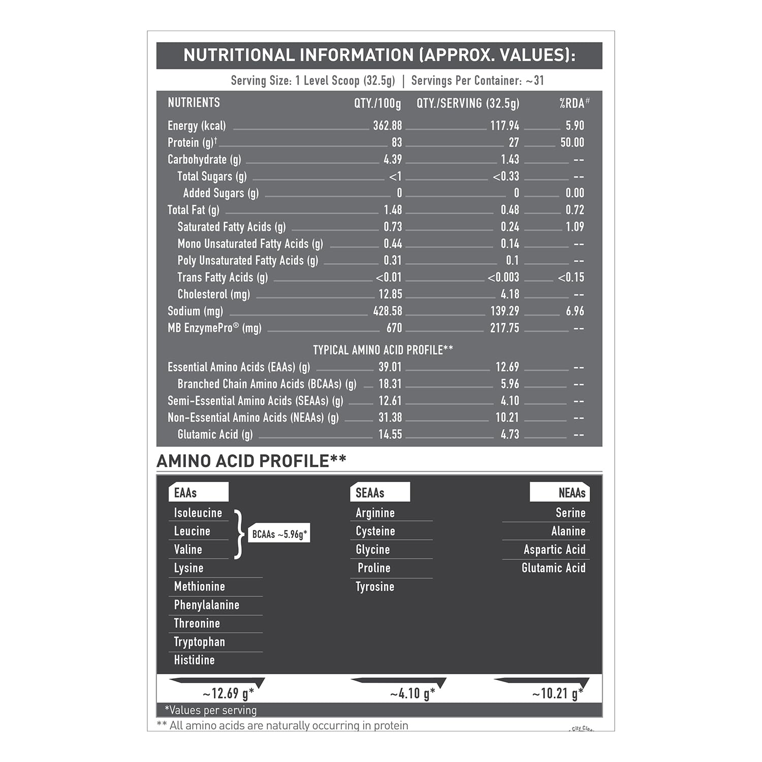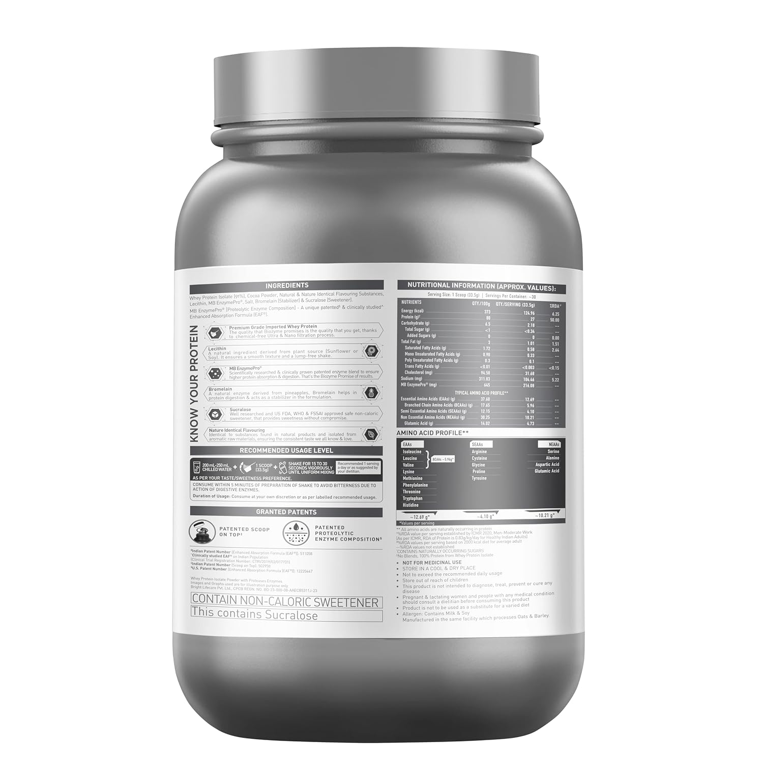 Whey Protein Isolate, Cocoa Powder, Anticaking Agents (Dibasic Calcium Phosphate & INS 551), Emulsifier (INS 322 (i)), MB EnzymePro®, Natural and Nature Identical Flavouring Substances, Sodium Chloride & Sweetener (INS 955)