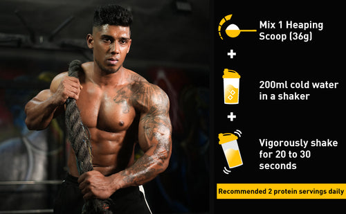 Add 1 level scoop (36g) of Muscleblaze Biozyme Whey Protein to 200 ml of cold water. Blend for 30 seconds for a delicious shake. Take 1-2 protein shakes per day or follow your dietician’s advice.