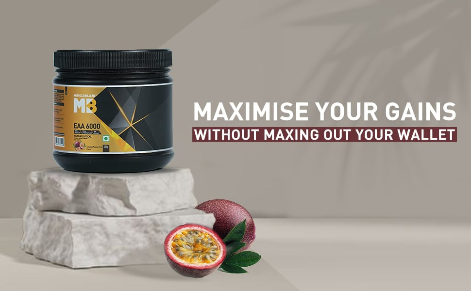 HOW TO CONSUME MUSCLEBLAZE EAA 6000, Mix one scoop of MuscleBlaze EAA 6000 powder in chilled water in volume as per your liking. For an ideal taste : 300-350ml WHEN TO CONSUME MUSCLEBLAZE EAA 6000, You can consume up to 2 scoops of MuscleBlaze EAA 6000 each day. It can be consumed : During your workout session : MuscleBlaze EAA 6000 during workout help fuel the muscles with the necessary essential amino acids In between meals : In case of long gaps between meals, you may consume this supplement to prevent any muscle loss.