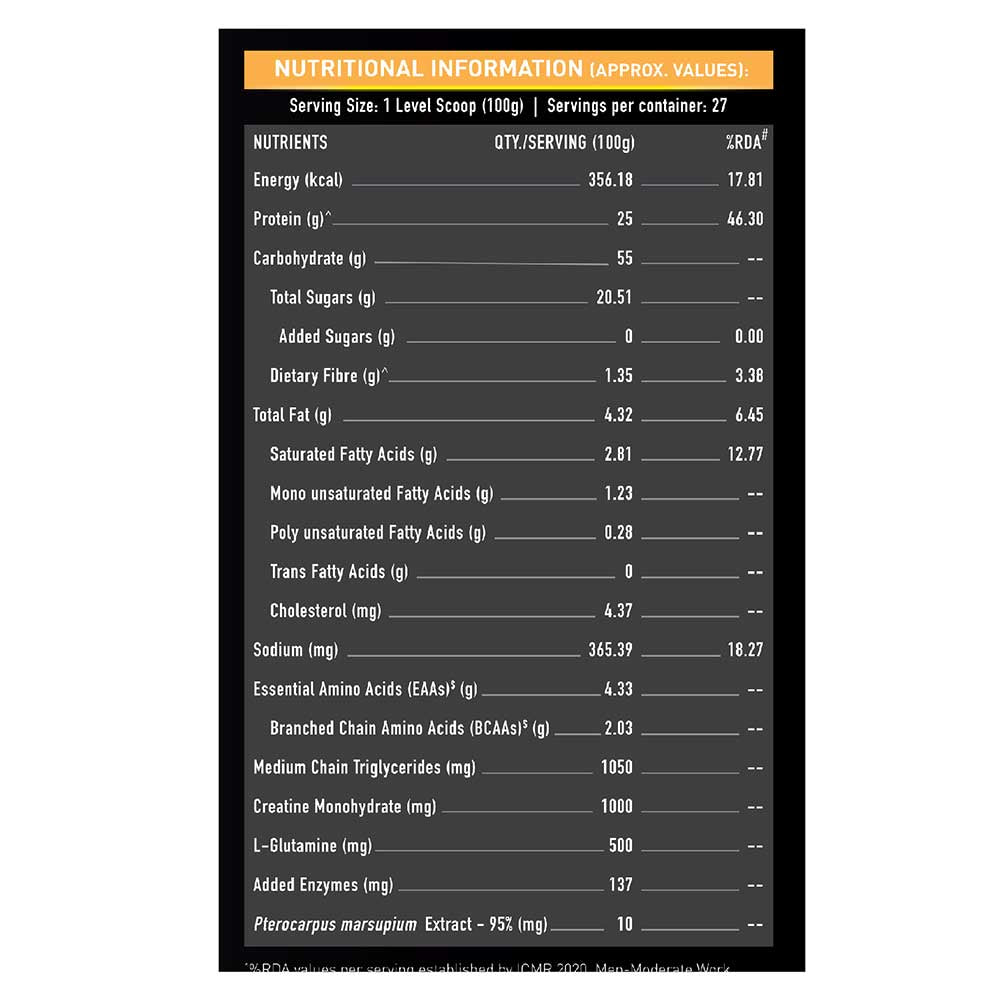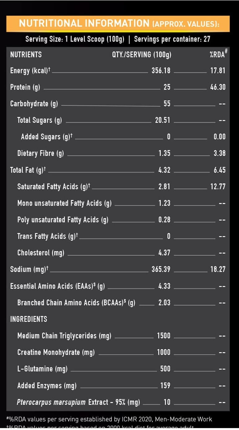 Milk Solids (Skimmed Milk Powder, Whey Protein Concentrate and Whey Protein Isolate, Maltodextrin, Palatinose (Isomaltulose), Cocoa Powder, Fat Powder, Nature Identical Flavoring Substances, Creatine Monohydrate, Oat Fibre, Medium Chain Triglycerides, Oat Flour, L-Glutamine, Emulsifier [INS 322 (ill. Enzymes (Amylases, Lactase, Proteases), Sweetener INS 955), Pterocarpus Marsupium Extract 95%.