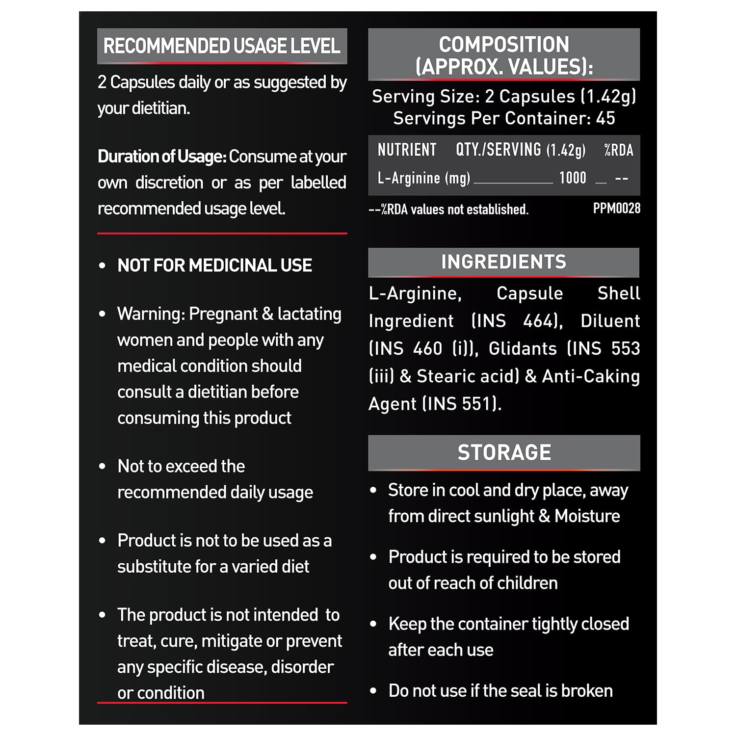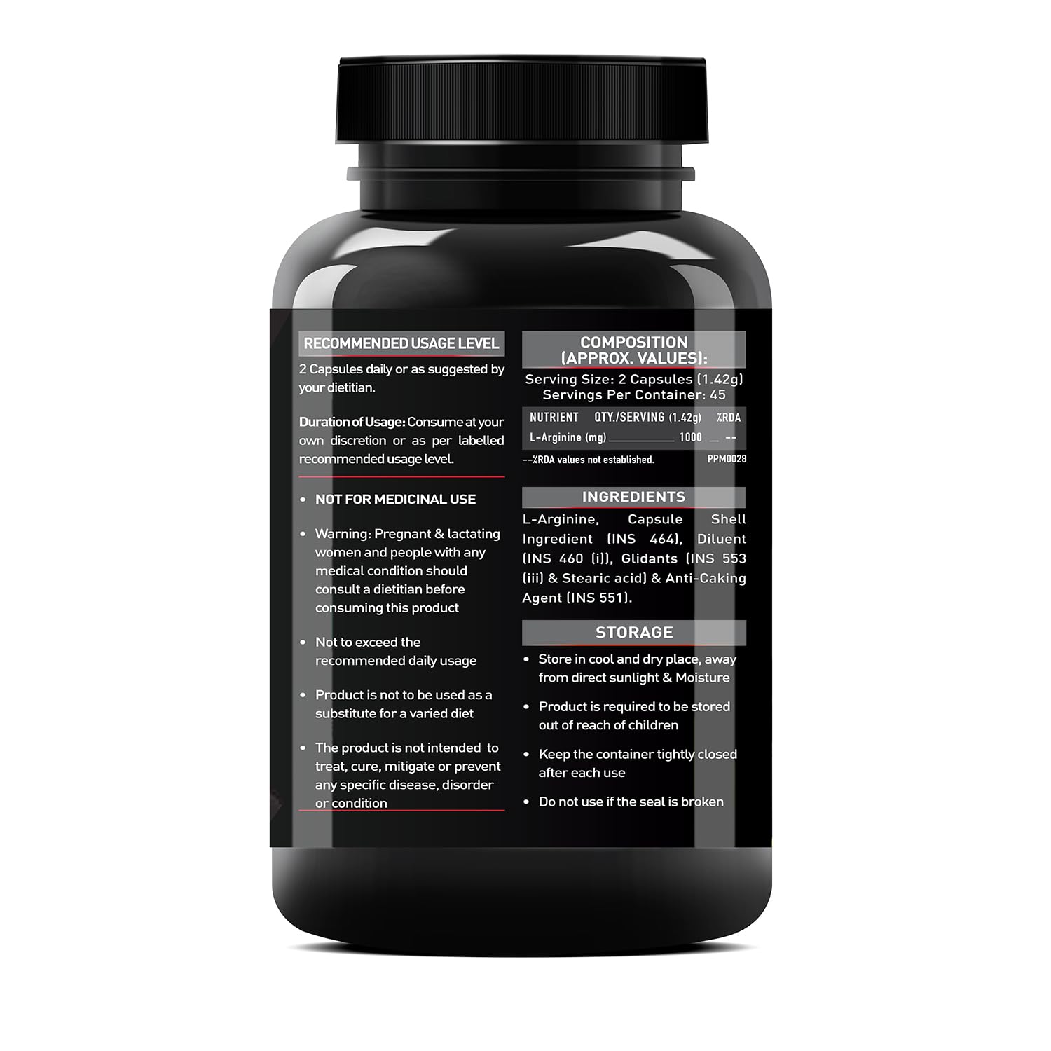 1000mg L-Arginine per Serving : Each serving contains 2 capsules (500mg each) of high-quality L-Arginine, a precursor to nitric oxide, which helps improve blood flow, build muscle mass, and support protein synthesis.
