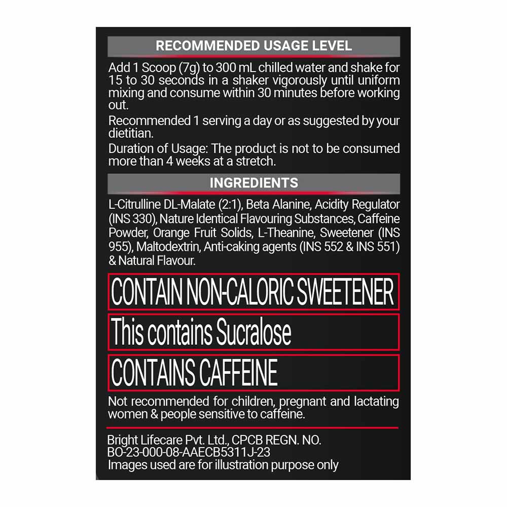 L-Citrulline DL-Malate (2 : 1), Beta-Alanine, Orange Fruit Powder, Caffeine {Caffeine Anhydrous & Micro Encapsulated Caffeine (NESCAFE)}, L-Theanine, Nature Identical Flavouring Substance, Sweetener (INS 955), Anticaking Agent (INS 552), Acidity Regulator (INS 330) & Synthetic Food Colour (INS 124).
