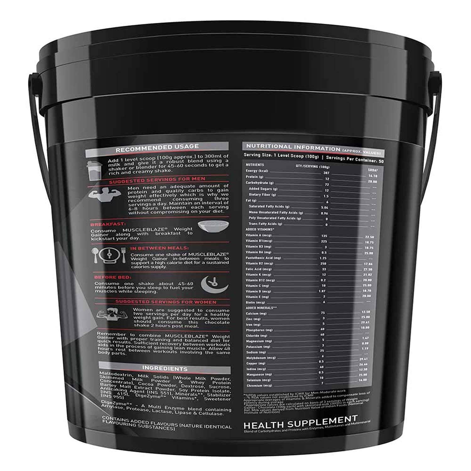 Maltodextrin, Skimmed Milk Powder, Fat Powder, Barley Malt Extract, Cocoa Powder, Sucrose, Dextrose Monohydrate, Whey Protein Concentrate, Anticaking Agent (INS 551), Minerals, Nature Identical Flavouring Substances, Stabilizer (INS 415), Proprietary Enzyme Blend, Vitamins, Sweetener (INS 955) & Emulsifier (INS (322(i)).