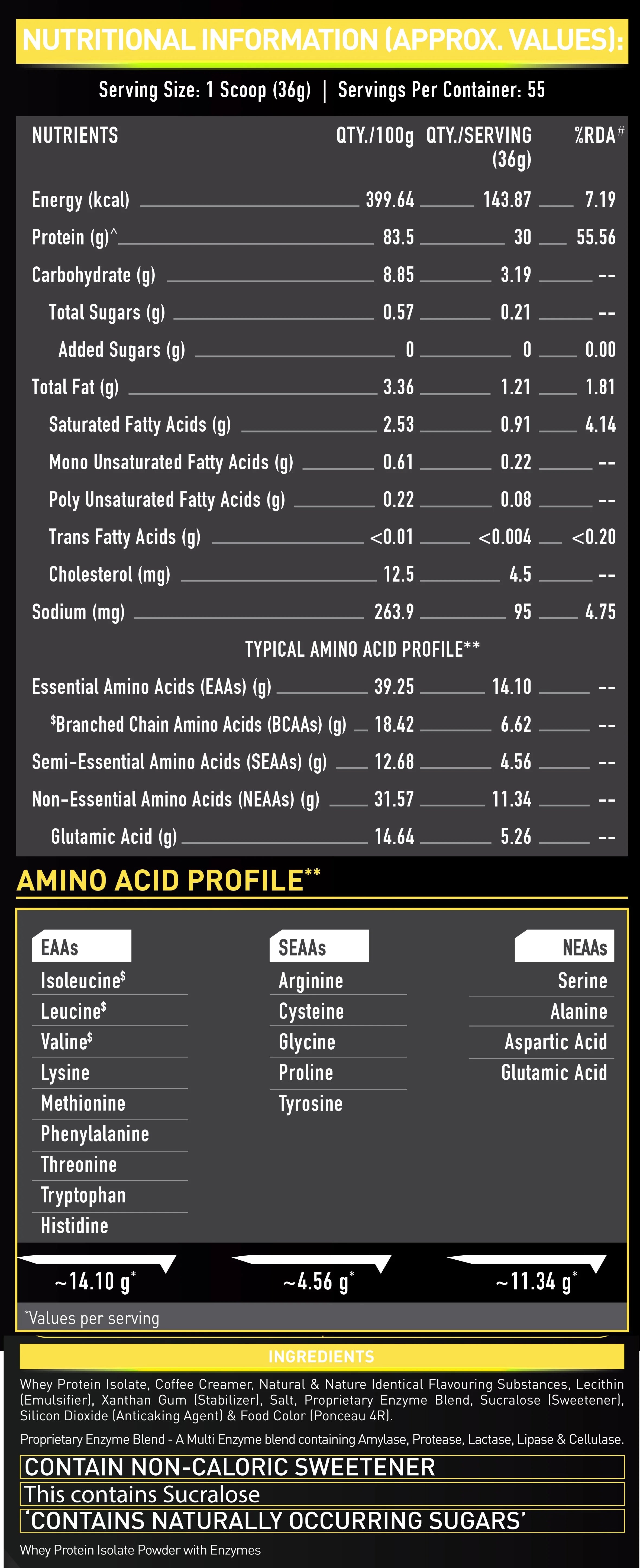 Whey Protein Isolate, Cocoa Powder, Nature Identical Flavoring Substances, Emulsifier [INS 322(i)], Sodium Chloride, Stabilizer (INS 415), Proprietary Enzyme Blend, Sweetener (INS 955), & Anticaking Agent (INS 551). Proprietary Enzyme Blend : A Multi Enzyme Blend containing Amylase, Protease, Lactase, Lipase, & Cellulase.