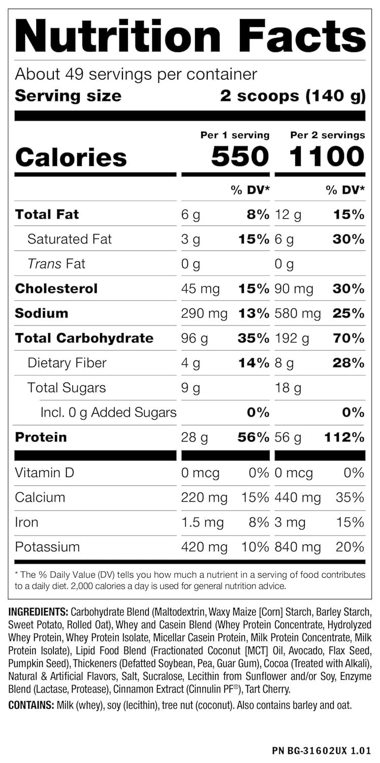 Each serving of Mutant Mass delivers 52 grams of muscle-building protein, carefully sourced to maximize amino acid absorption and fuel muscle repair. Designed for athletes in intense training, this protein matrix ensures consistent muscle nourishment for optimal mass gains.