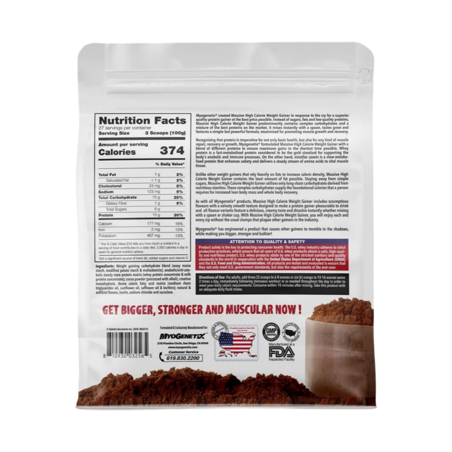 Myogenetix® created Massive High Calorie Weight Gainer in response to the cry for a superior quality protein gainer at the best price possible. Instead of sugars, fats, and low-quality proteins, Myogenetix Massive High Calorie Weight Gainer predominantly contains complex carbohydrates and a mixture of the best proteins on the market.