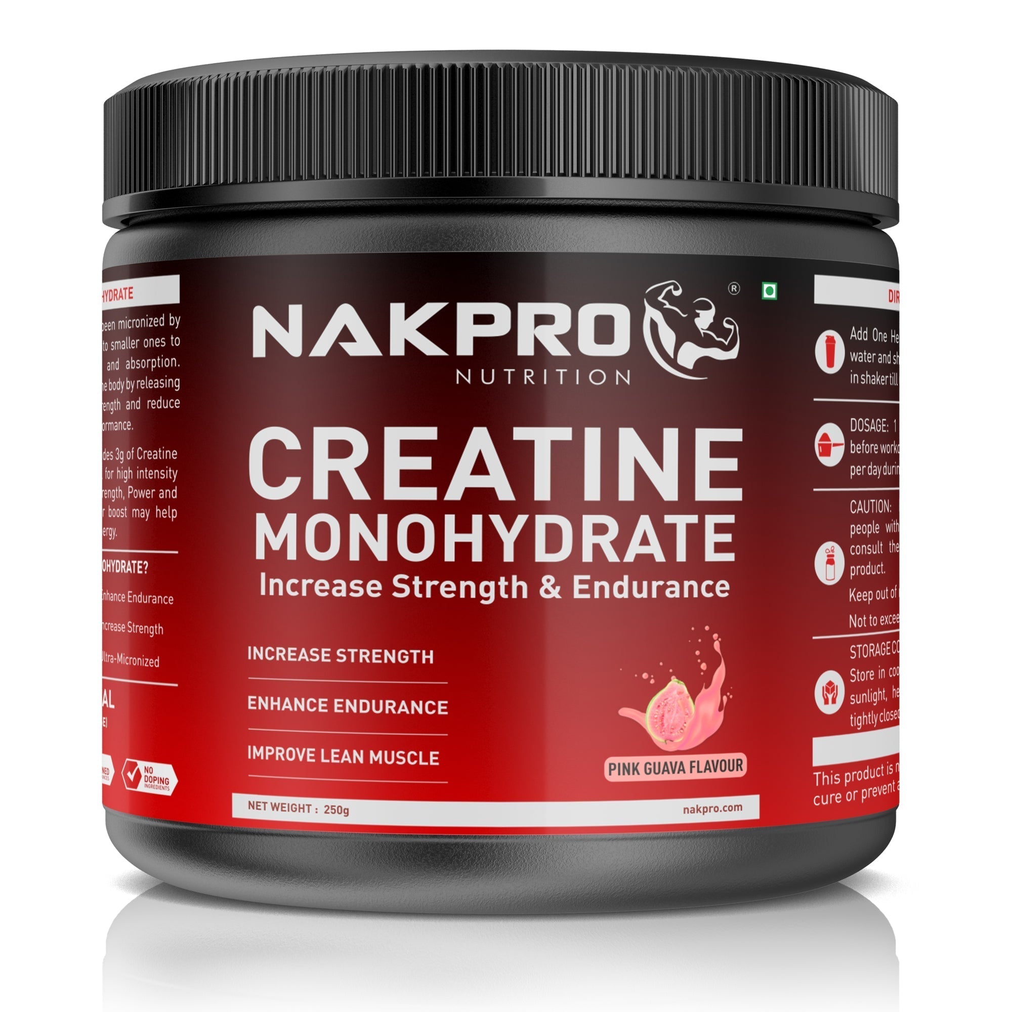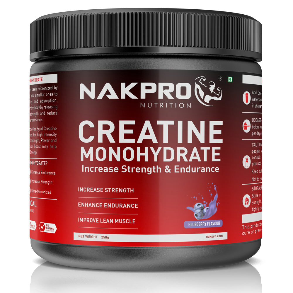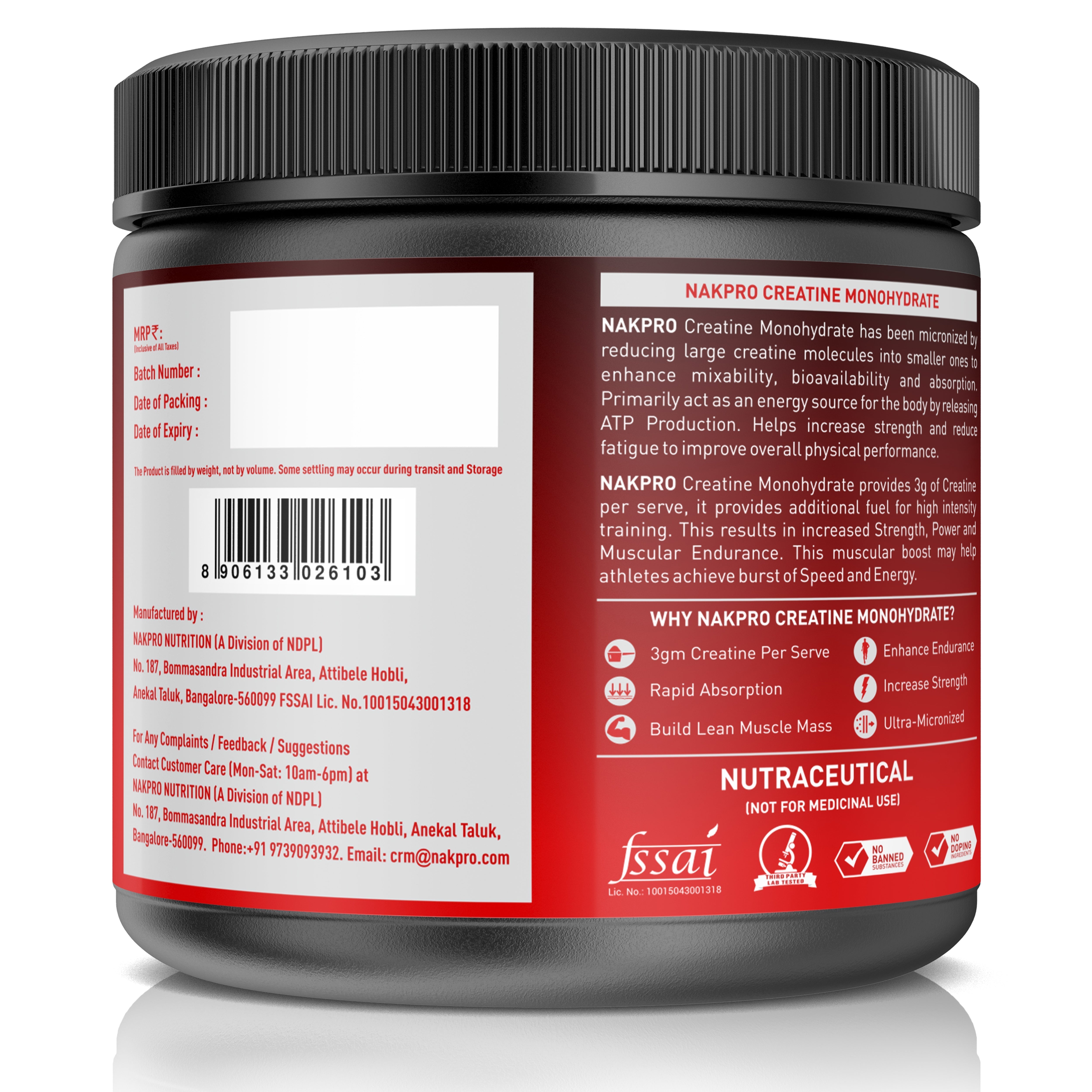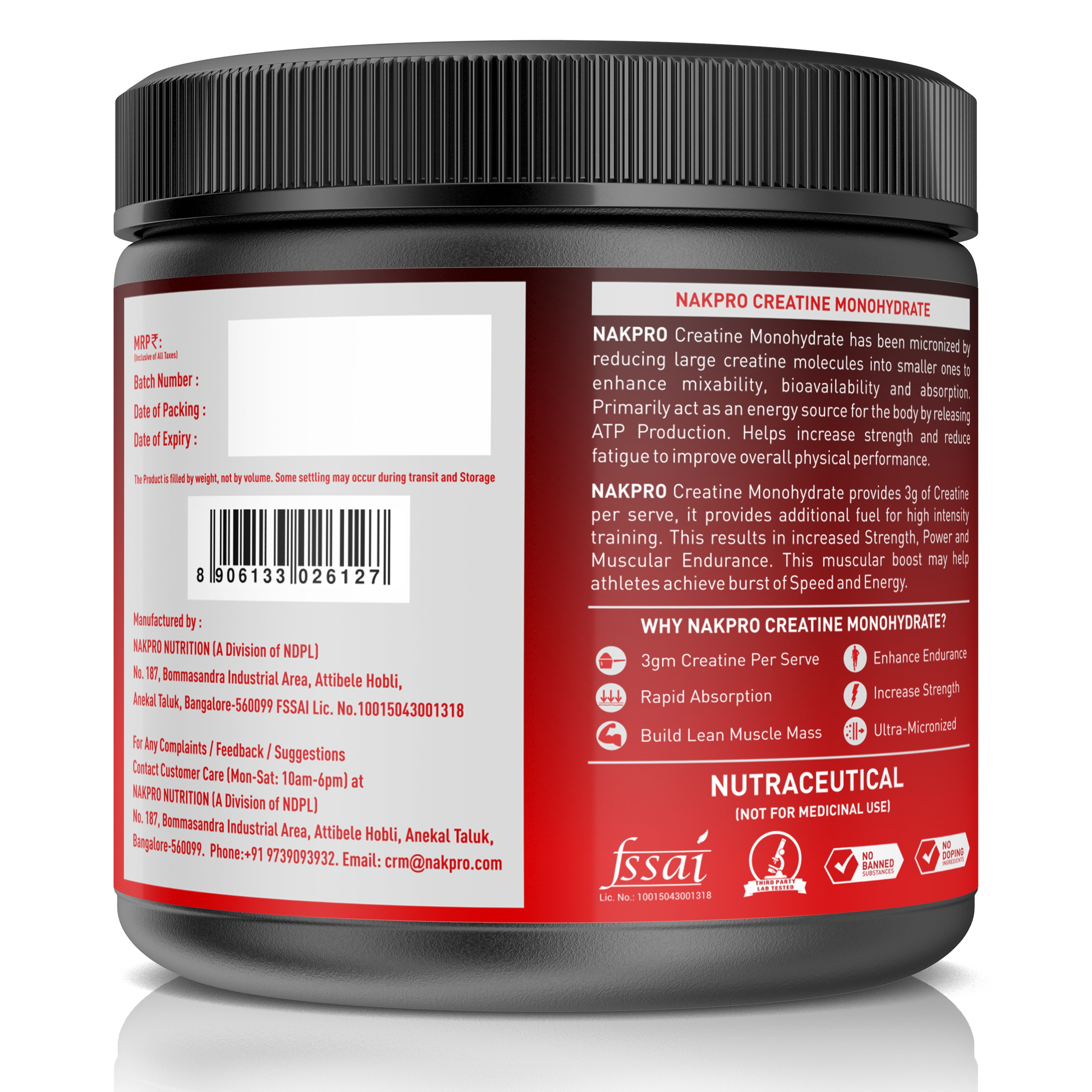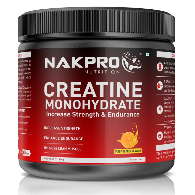 NAKPRO Creatine Monohydrate provides 4g of Creatine per serve, it provides additional fuel for high intensity training. This results in increased Strength, Power and Muscular Endurance. This muscular boost may help athletes achieve burst of Speed and Energy. Nakpro Micronized creatine monohydrate is essential in the process of sending energy directly to muscles and has been shown to help increase overall muscle mass and boost strength. Nakpro Sports Advance Micronised Creatine Monohydrate is the most potent, unadulterated and finest creatine powder helps in improving strength, power and allows to gain lean muscle mass